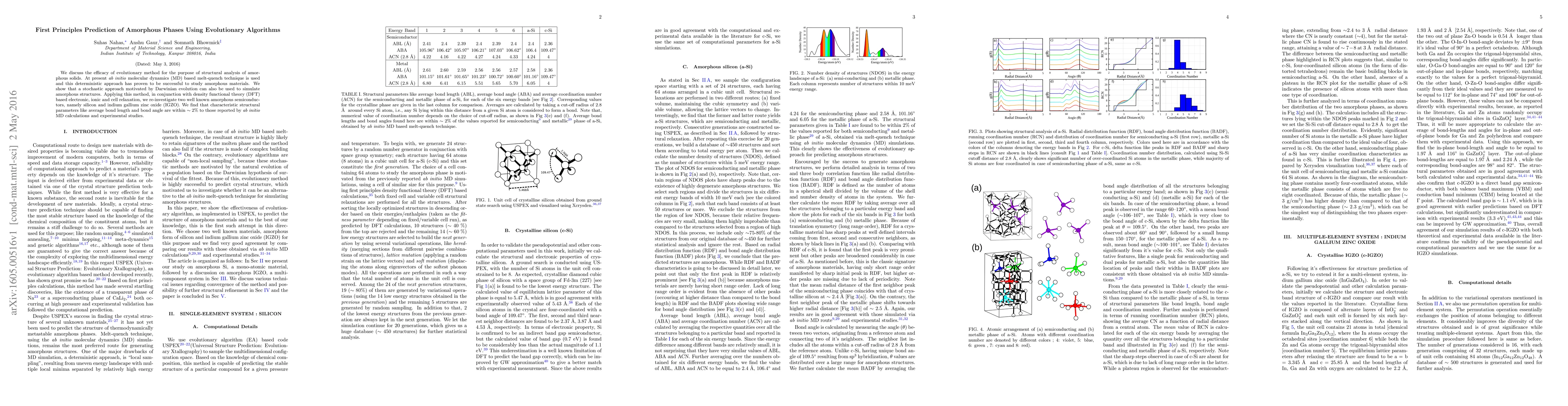 This paper explores the use of evolutionary algorithms for predicting amorphous phases, demonstrating their effectiveness through simulations of silicon and IGZO. The results show that the stochastic evolutionary method, combined with density functional theory, yields structural parameters comparable to those obtained from ab initio molecular dynamics and experimental data.