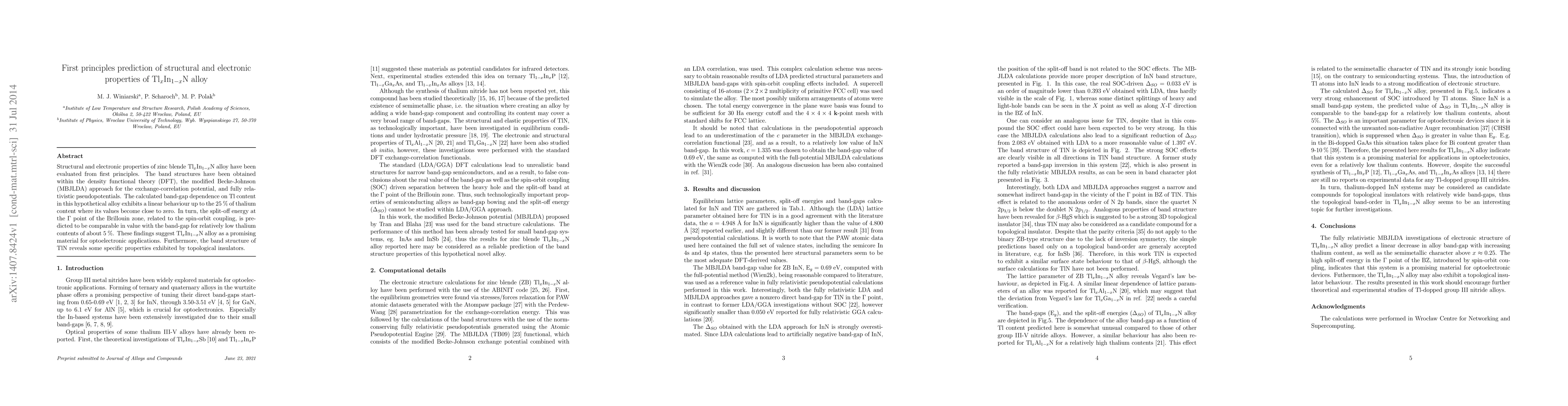 Structural and electronic properties of zinc blende TlxIn(1-x)N alloy have been evaluated from first principles. The band structures have been obtained within the density functional theory (DFT), the modified Becke-Johnson (MBJLDA) approach for the exchange-correlation potential, and fully relativistic pseudopotentials. The calculated band-gap dependence on Tl content in this hypothetical alloy exhibits a linear behaviour up to the 25 % of thalium content where its values become close to zero. In turn, the split-off energy at the Gamma point of the Brillouin zone, related to the spin-orbit coupling, is predicted to be comparable in value with the band-gap for relatively low thalium contents of about 5 %. These findings suggest TlxIn(1-x)N alloy as a promising material for optoelectronic applications. Furthermore, the band structure of TlN reveals some specific properties exhibited by topological insulators.