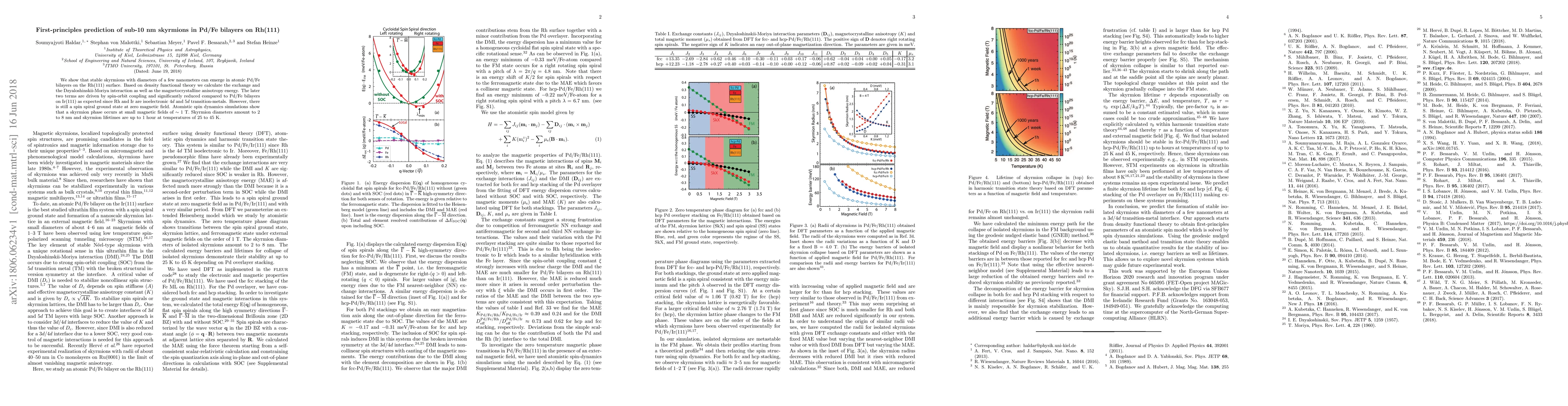 This study predicts stable sub-10 nm skyrmions in Pd/Fe bilayers on Rh(111) using density functional theory, revealing reduced Dzyaloshinskii-Moriya and magnetocrystalline anisotropy energies due to spin-orbit coupling. Simulations show a skyrmion phase at low magnetic fields with diameters of 2 to 8 nm and lifetimes up to an hour at 25-45 K.