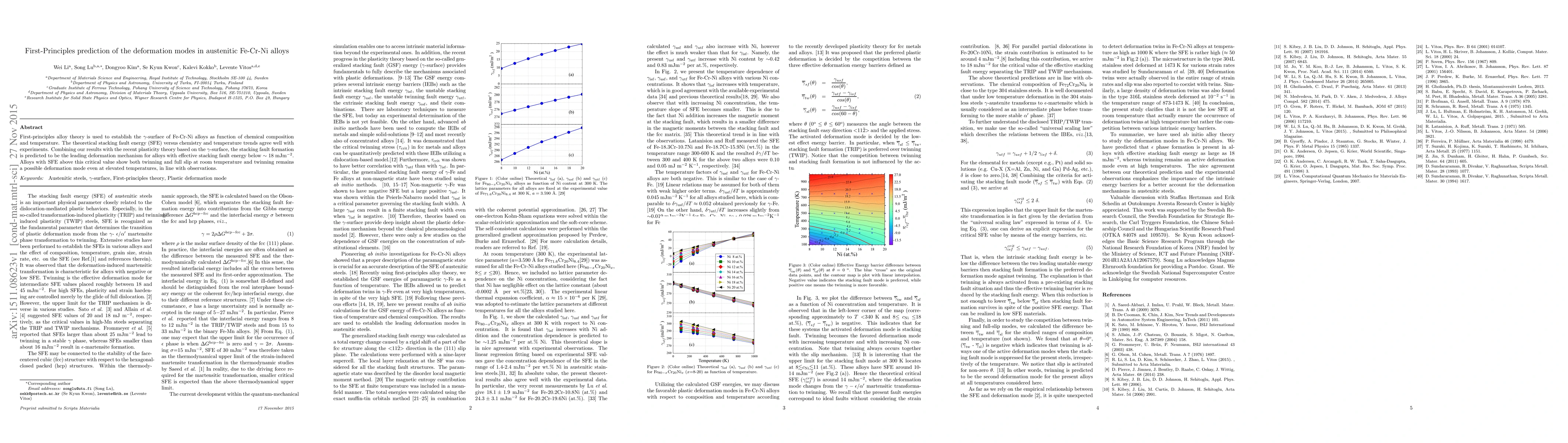 First-principles alloy theory is used to establish the $\gamma$-surface of Fe-Cr-Ni alloys as function of chemical composition and temperature. The theoretical stacking fault energy (SFE) versus chemistry and temperature trends agree well with experiments. Combining our results with the recent plasticity theory based on the $\gamma$-surface, the stacking fault formation is predicted to be the leading deformation mechanism for alloys with effective stacking fault energy below about 18 mJ m$^{-2}$. Alloys with SFE above this critical value show both twinning and full slip at room temperature and twinning remains a possible deformation mode even at elevated temperatures, in line with observations.