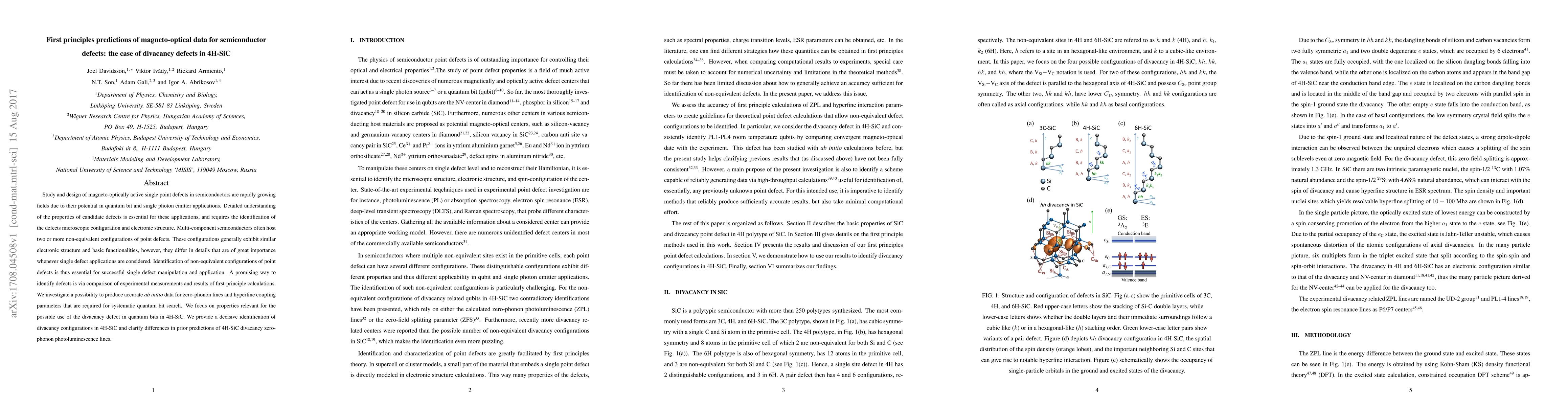 Study and design of magneto-optically active single point defects in semiconductors are rapidly growing fields due to their potential in quantum bit and single photon emitter applications. Detailed understanding of the properties of candidate defects is essential for these applications, and requires the identification of the defects microscopic configuration and electronic structure. Multi-component semiconductors often host two or more non-equivalent configurations of point defects. These configurations generally exhibit similar electronic structure and basic functionalities, however, they differ in details that are of great importance whenever single defect applications are considered. Identification of non-equivalent configurations of point defects is thus essential for successful single defect manipulation and application. A promising way to identify defects is via comparison of experimental measurements and results of first-principle calculations. We investigate a possibility to produce accurate ab initio data for zero-phonon lines and hyperfine coupling parameters that are required for systematic quantum bit search. We focus on properties relevant for the possible use of the divacancy defect in quantum bits in 4H-SiC. We provide a decisive identification of divacancy configurations in 4H-SiC and clarify differences in prior predictions of 4H-SiC divacancy zero-phonon photoluminescence lines.