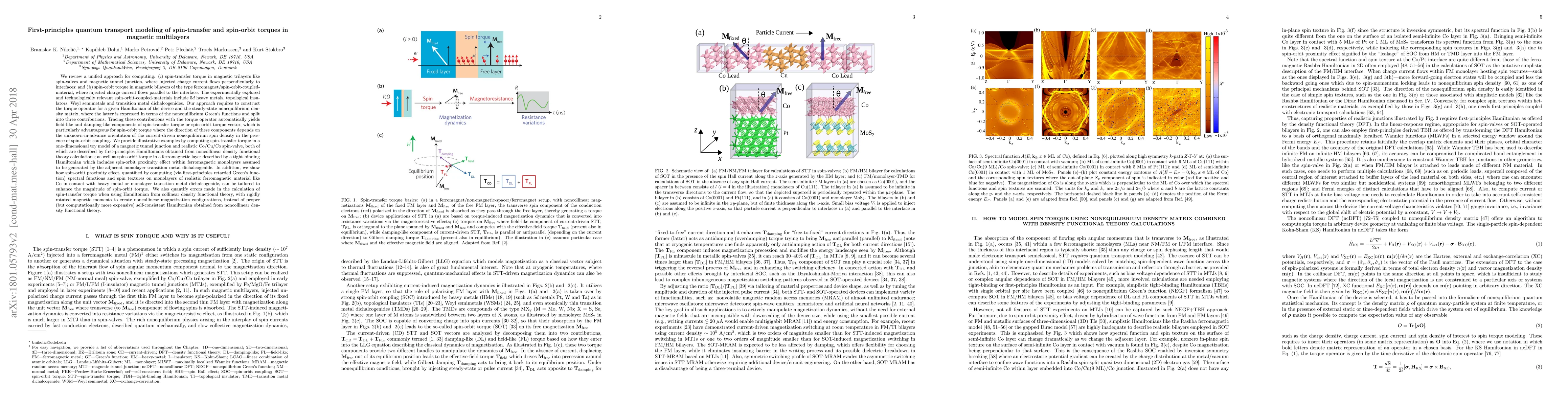 This paper presents a first-principles quantum transport model for computing spin-transfer and spin-orbit torques in magnetic multilayers, including spin-valves and magnetic tunnel junctions. The approach constructs a torque operator from the device's Hamiltonian and nonequilibrium density matrix, yielding field-like and damping-like components, particularly useful for spin-orbit torques.