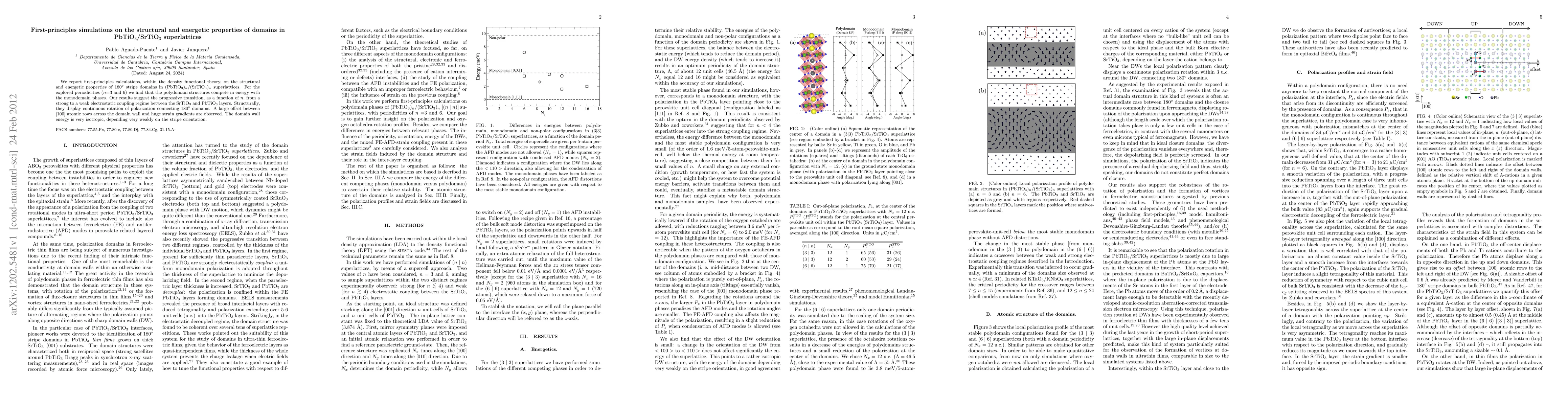 This paper uses first-principles density functional theory to investigate the structural and energetic properties of 180$^\circ$ stripe domains in PbTiO$_3$/SrTiO$_3$ superlattices, finding that polydomain structures are energetically competitive with monodomain phases, with a transition from strong to weak electrostatic coupling as the periodicity increases.
