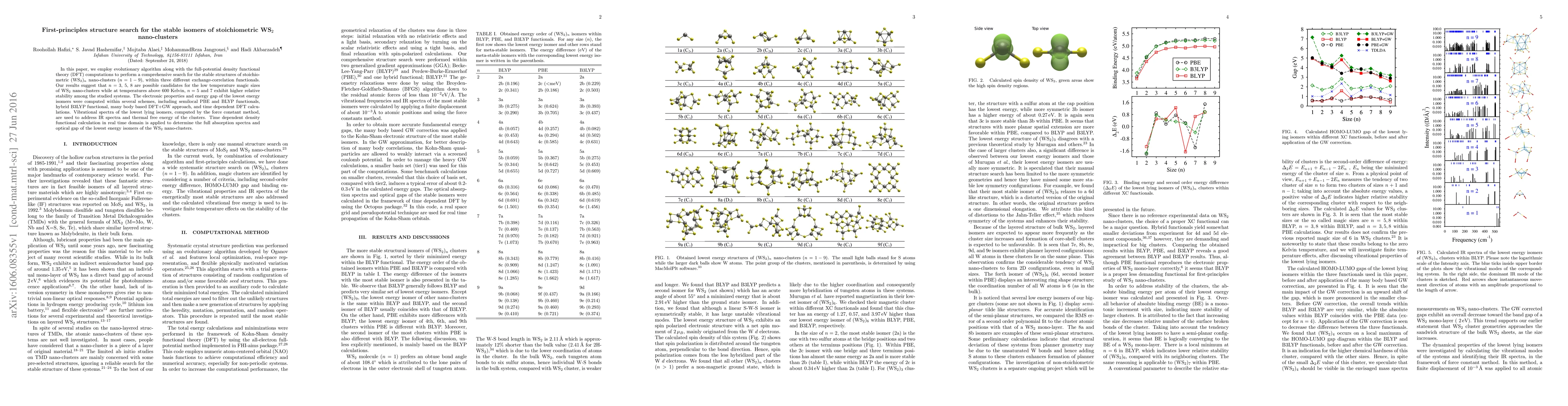 This paper uses evolutionary algorithms and DFT to identify stable structures of WS2 nano-clusters (n=1-9), finding that n=3, 5, 8 are low-temperature magic sizes, and n=5, 7 are more stable above 600K. It also analyzes electronic properties, energy gaps, and optical spectra using various computational methods.