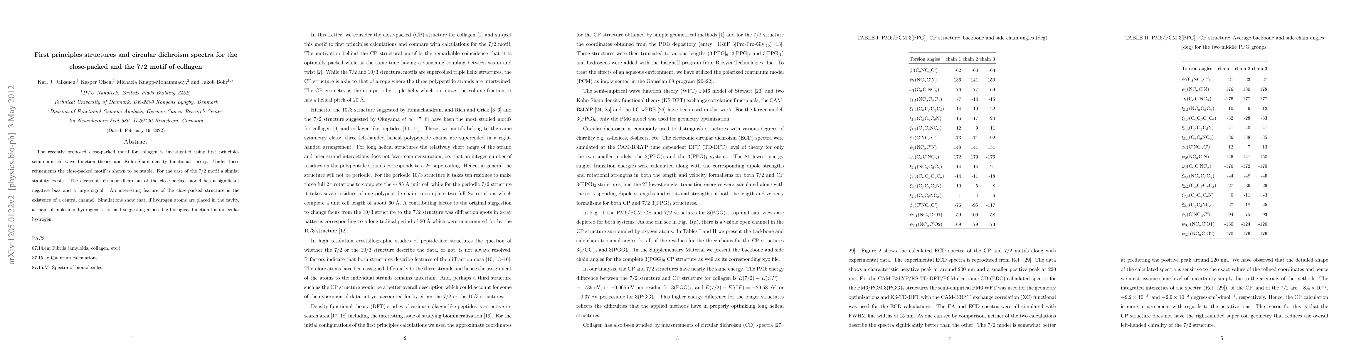 This study uses first principles theory to demonstrate the stability of the close-packed and 7/2 collagen motifs. The close-packed structure exhibits a significant negative circular dichroism signal, and simulations suggest a central channel could potentially harbor molecular hydrogen, hinting at a possible biological role.