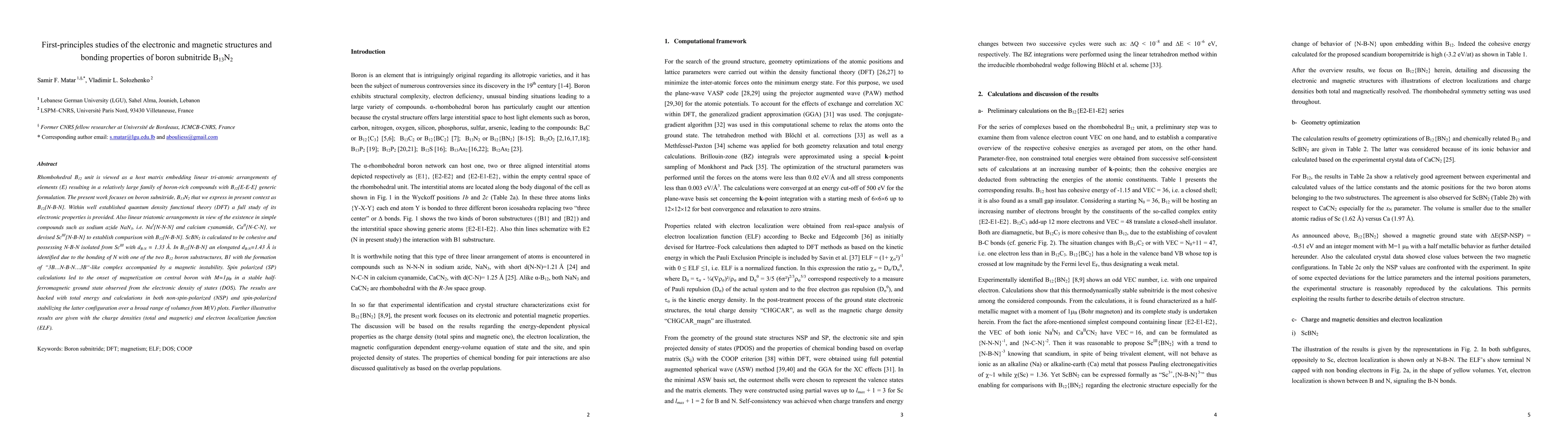 Rhombohedral B$_{12}$ unit is viewed as a host matrix embedding linear tri-atomic arrangements of elements (E) resulting in a relatively large family of boron-rich compounds with B$_{12}${E-E-E} generic formulation. The present work focuses on boron subnitride, B$_{13}$N$_2$ that we express in present context as B$_{12}${N-B-N}. Within well established quantum density functional theory (DFT) a full study of its electronic properties is provided. Also linear triatomic arrangements in view of the existence in simple compounds such as sodium azide NaN$_3$, i.e., Na$^I${N-N-N} and calcium cyanamide, Ca$^{II}${N-C-N}, we devised Sc$^{III}${N-B-N} to establish comparison with B$_{12}${N-B-N}. ScBN$_2$ is calculated to be cohesive and possessing N-B-N isolated from ScIII with dB-N = 1.33 {\AA}. In B$_{12}${N-B-N} an elongated dB-N=1.43 {\AA} is identified due to the bonding of N with one of the two B12 boron substructures, B1 with the formation of "3B...N-B-N...3B"-like complex accompanied by a magnetic instability. Spin polarized (SP) calculations led to the onset of magnetization on central boron with M=1 $\mu_B$ in a stable half-ferromagnetic ground state observed from the electronic density of states (DOS). The results are backed with total energy and calculations in both non-spin-polarized (NSP) and spin-polarized stabilizing the latter configuration over a broad range of volumes from M(V) plots. Further illustrative results are given with the charge densities (total and magnetic) and electron localization function (ELF).