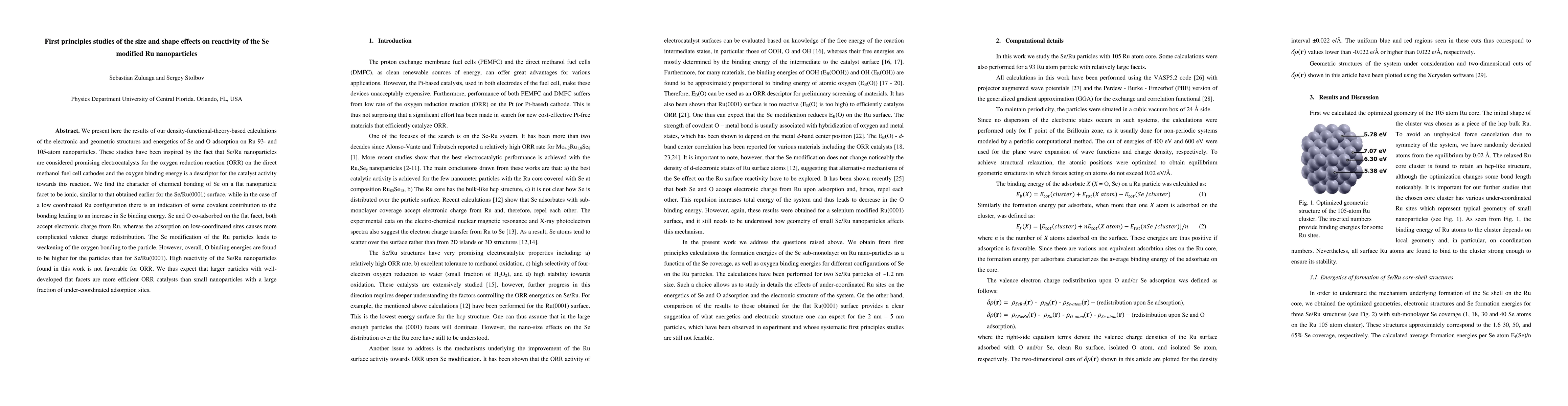 This study uses density-functional theory to investigate the reactivity of Se-modified Ru nanoparticles, revealing that Se bonding is ionic on flat facets but shows covalent characteristics on low-coordinated sites, leading to higher Se binding energy. The Se modification weakens oxygen binding, suggesting larger particles with flat facets are more efficient catalysts for the oxygen reduction reaction than small nanoparticles.