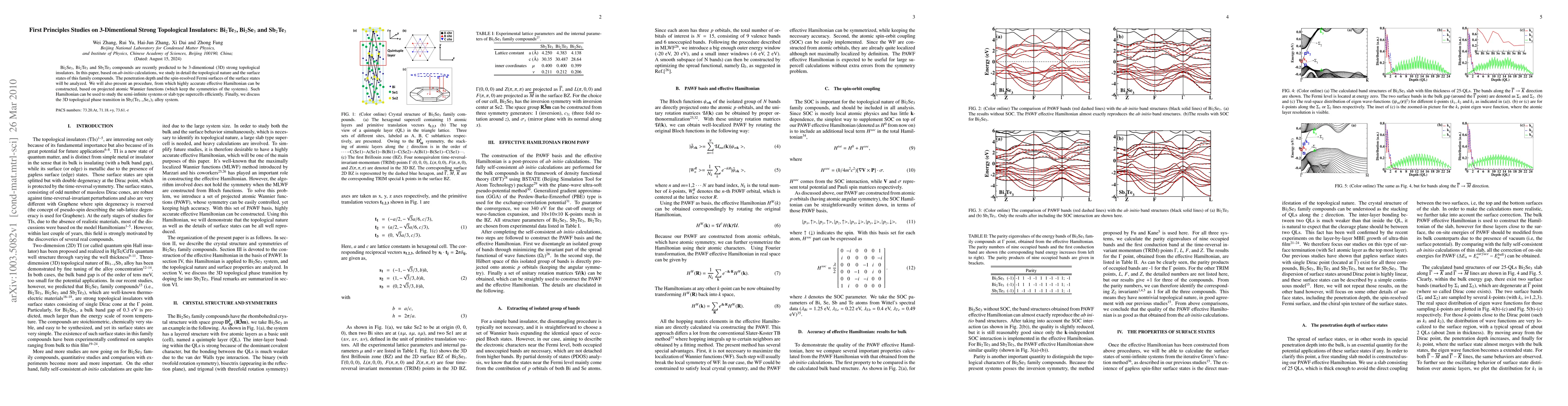 This paper uses ab-initio calculations to study the topological nature and surface states of 3D strong topological insulators Bi2Se3, Bi2Te3, and Sb2Te3, analyzing their spin-resolved Fermi surfaces and penetration depth. It also presents a method to construct highly accurate effective Hamiltonians based on projected atomic Wannier functions for efficient study of semi-infinite systems. Additionally, it discusses the topological phase transition in the Sb2(Te1-xSex)3 alloy.