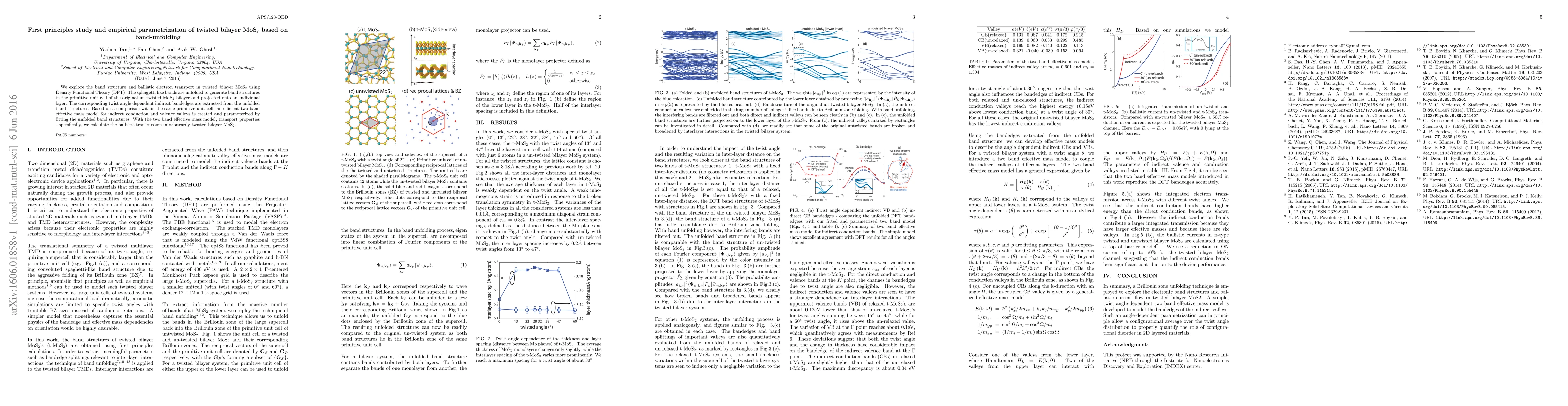 This study uses Density Functional Theory (DFT) to explore twisted bilayer MoS2, unfolding sphagetti bands to extract angle-dependent bandedges. A two-band effective mass model is then developed and used to calculate ballistic transmission in arbitrarily twisted MoS2 bilayers.