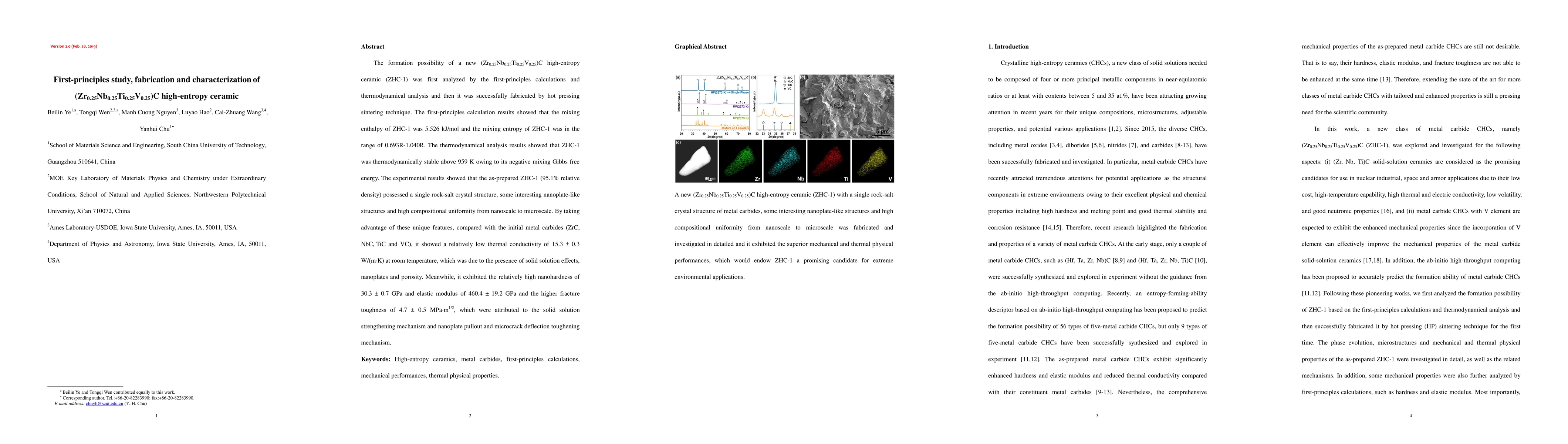 A new high-entropy ceramic, ZHC-1, with unique properties was fabricated and characterized, showing low thermal conductivity, high nanohardness, and high fracture toughness due to solid solution strengthening and nanoplate effects.