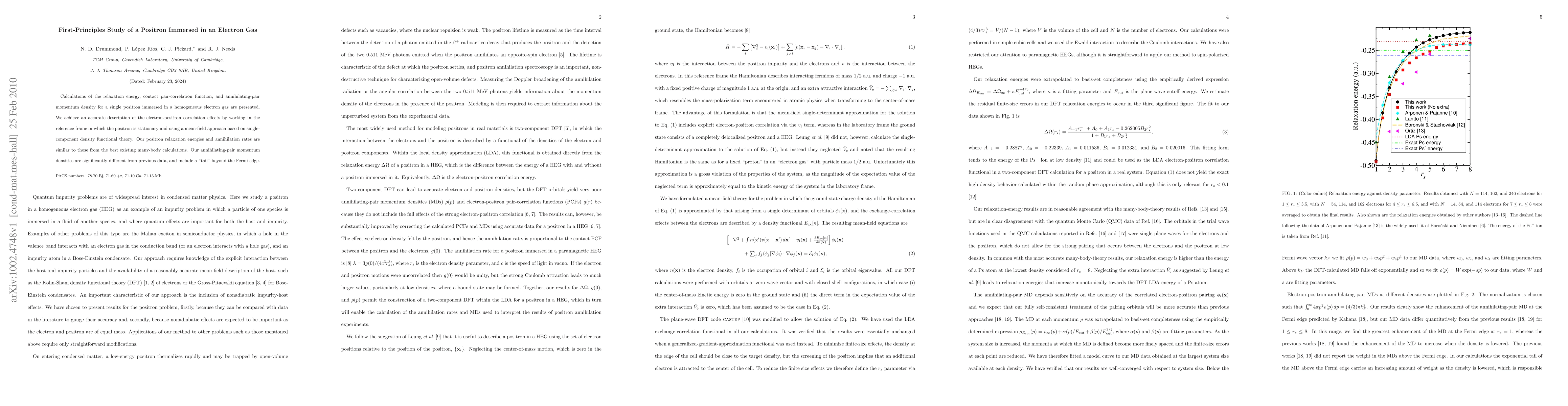 This paper presents a first-principles study using density functional theory to analyze a positron in an electron gas, revealing accurate positron relaxation energies and annihilation rates. Notably, the annihilating-pair momentum density shows a "tail" beyond the Fermi edge, differing from previous data.