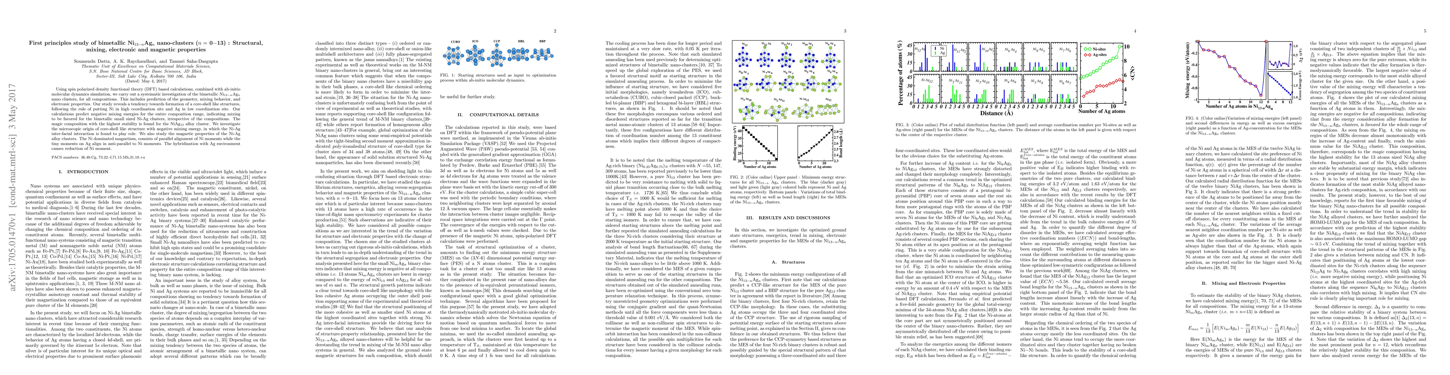 The study investigates bimetallic Ni$_{13-n}$Ag$_n$ nano-clusters and finds a tendency towards core-shell structures with negative mixing energies, favoring Ni-Ag small clusters. The magic composition is found for NiAg$_{12}$, with Ni-dominated magnetism and reduced Ni moments due to hybridization with Ag environment.
