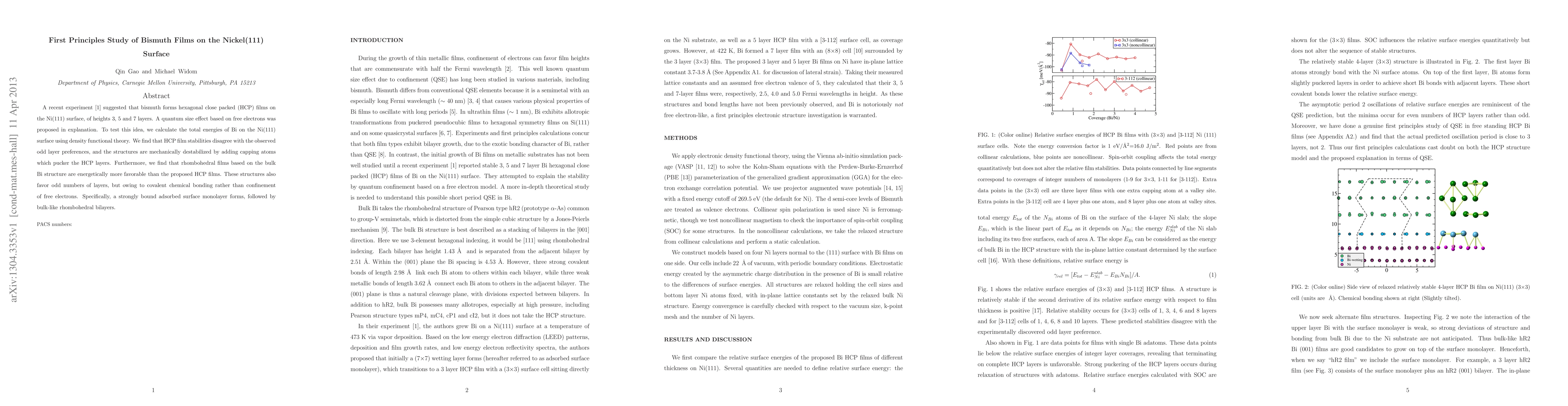 A recent experiment(Bollmann11) suggested that bismuth forms hexagonal close packed (HCP) films on the Ni(111) surface, of heights 3, 5 and 7 layers. A quantum size effect based on free electrons was proposed in explanation. To test this idea, we calculate the total energies of Bi on the Ni(111) surface using density functional theory. We find that HCP film stabilities disagree with the observed odd layer preferences, and the structures are mechanically destabilized by adding capping atoms which pucker the HCP layers. Furthermore, we find that rhombohedral films based on the bulk Bi structure are energetically more favorable than the proposed HCP films. These structures also favor odd numbers of layers, but owing to covalent chemical bonding rather than confinement of free electrons. Specifically, a strongly bound adsorbed surface monolayer forms, followed by bulk-like rhombohedral bilayers.