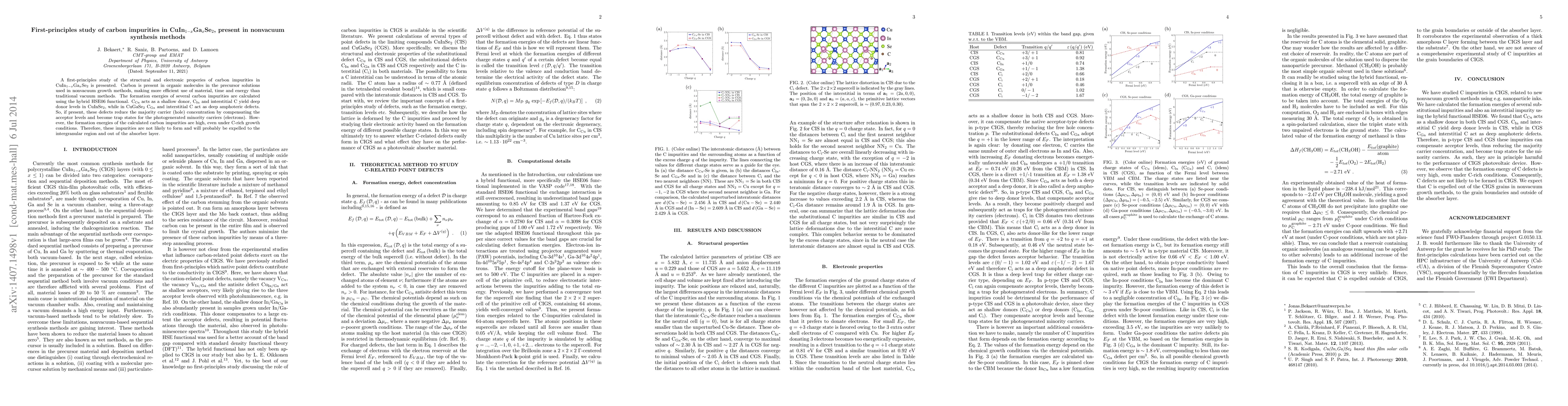 This study investigates carbon impurities in CuInGaSe2 grown using non-vacuum methods, finding they can act as shallow or deep defects that reduce carrier concentrations and act as trap states, but their formation energies are high, suggesting they may be expelled from the absorber layer.