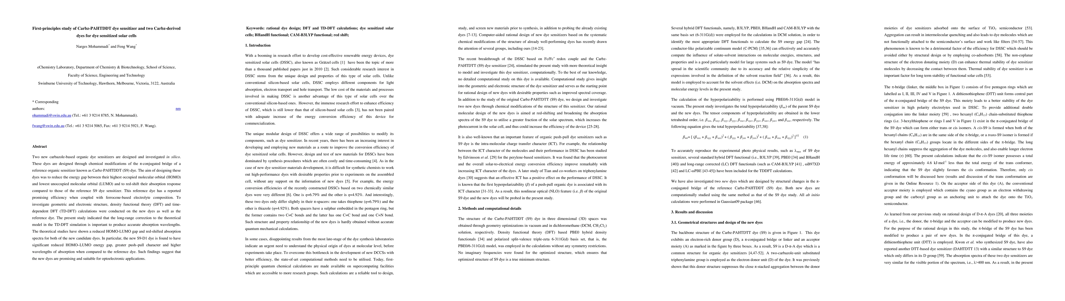 Two new carbazole-based organic dye sensitizers are designed and investigated in silico. These dyes are designed through chemical modifications of the conjugated bridge of a reference organic sensitizer known as Carbz-PAHTDDT (S9) dye. The aim of designing these dyes was to reduce the energy gap between their highest occupied molecular orbital (HOMO) and lowest unoccupied molecular orbital (LUMO) and to red-shift their absorption response compared to those of the reference S9 dye sensitizer. This reference dye has a reported promising efficiency when coupled with ferrocene-based electrolyte composition. To investigate geometric and electronic structure, density functional theory (DFT) and time-dependent DFT (TD-DFT) calculations were conducted on the new dyes as well as the reference dye. The present study indicated that the long-range correction to the theoretical model in the TD-DFT simulation is important to produce accurate absorption wavelengths.The theoretical studies have shown a reduced HOMO-LUMO gap and red-shifted absorption spectra for both of the new candidate dyes. Such findings suggest that the new dyes are promising and suitable for optoelectronic applications.