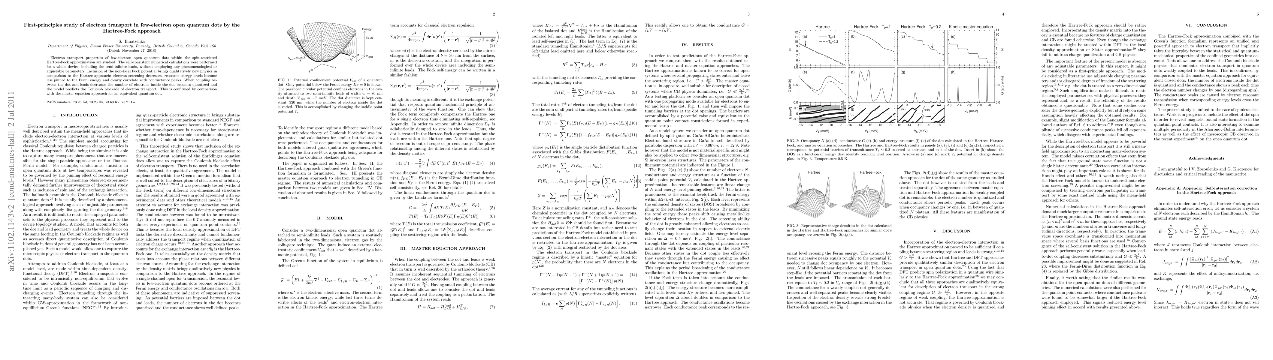 This study investigates electron transport in few-electron open quantum dots using the spin-restricted Hartree-Fock approach, revealing that the non-local Fock potential alters electron screening and correlates conductance peaks with resonant energy levels. The model predicts Coulomb blockade, validated by comparison with the master equation approach.