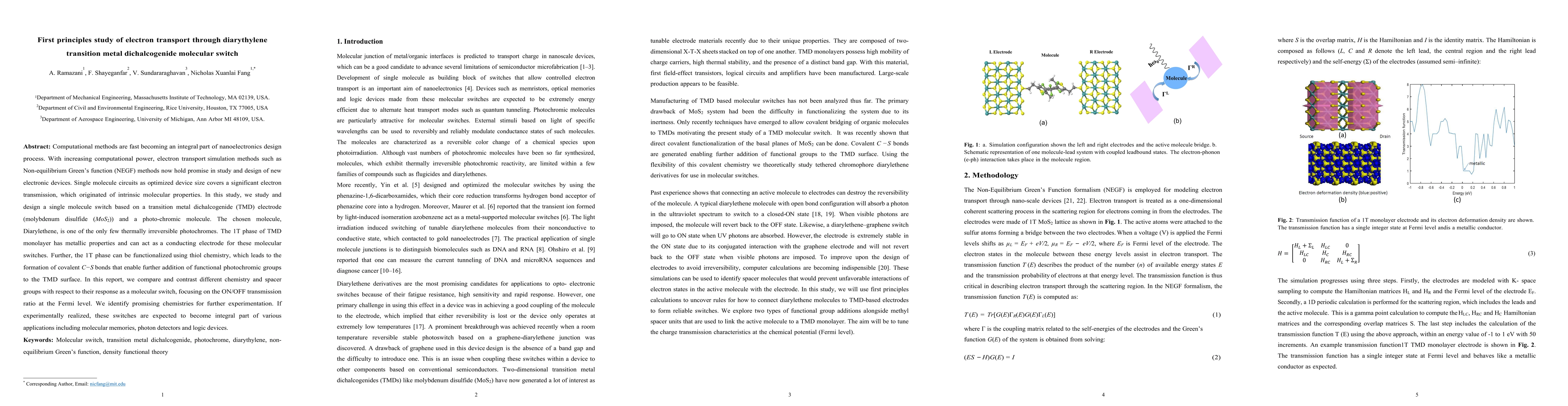 This study employs computational methods to investigate electron transport through a diarythylene-based molecular switch integrated with a transition metal dichalcogenide (MoS2) electrode. The research identifies optimal chemistries for high ON/OFF transmission ratios, aiming to develop single-molecule circuits for applications in molecular memories, photon detectors, and logic devices.