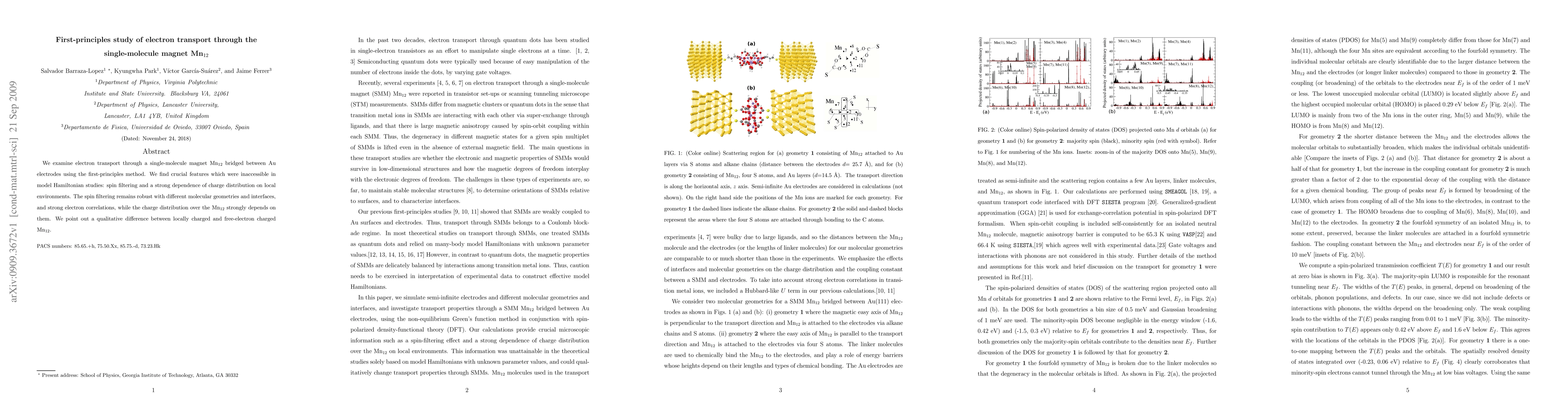 This study investigates electron transport through a single-molecule magnet Mn12 using first-principles methods, revealing robust spin filtering and strong dependence of charge distribution on local environments. The findings highlight a difference between locally charged and free-electron charged Mn12.