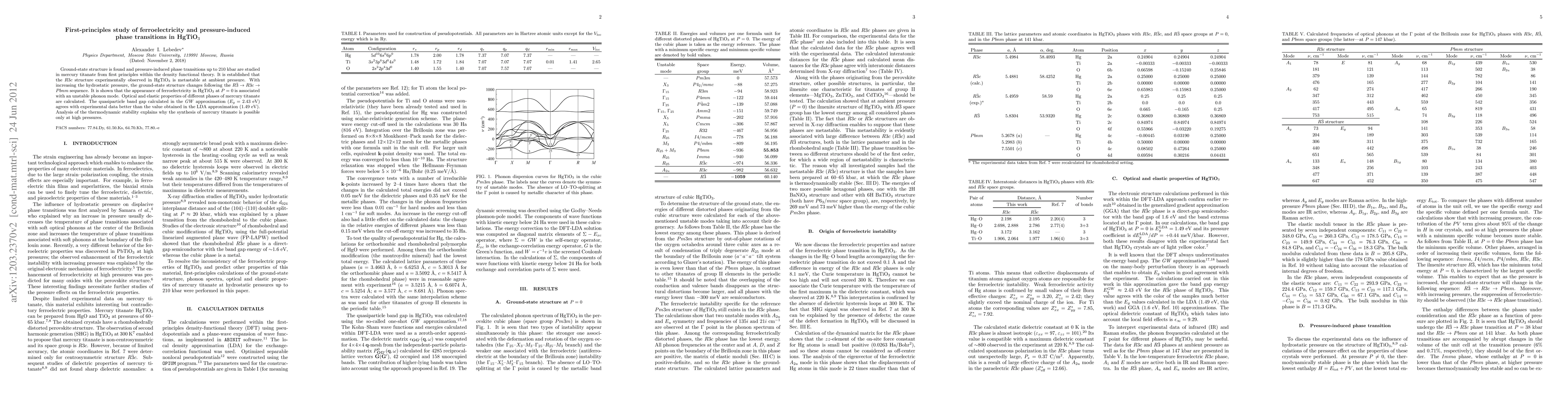 Ground-state structure is found and pressure-induced phase transitions up to 210 kbar are studied in mercury titanate from first principles within the density functional theory. It is established that the $R3c$ structure experimentally observed in HgTiO$_3$ is metastable at ambient pressure. With increasing the hydrostatic pressure, the ground-state structure changes following the $R{\bar 3} \to R3c \to Pbnm$ sequence. It is shown that the appearance of ferroelectricity in HgTiO$_3$ at $P = 0$ is associated with an unstable phonon mode. Optical and elastic properties of different phases of mercury titanate are calculated. The quasiparticle band gap calculated in the \emph{GW} approximation ($E_g = 2.43$ eV) agrees with experimental data better than the value obtained in the LDA approximation (1.49 eV). Analysis of the thermodynamic stability explains why the synthesis of mercury titanate is possible only at high pressures.