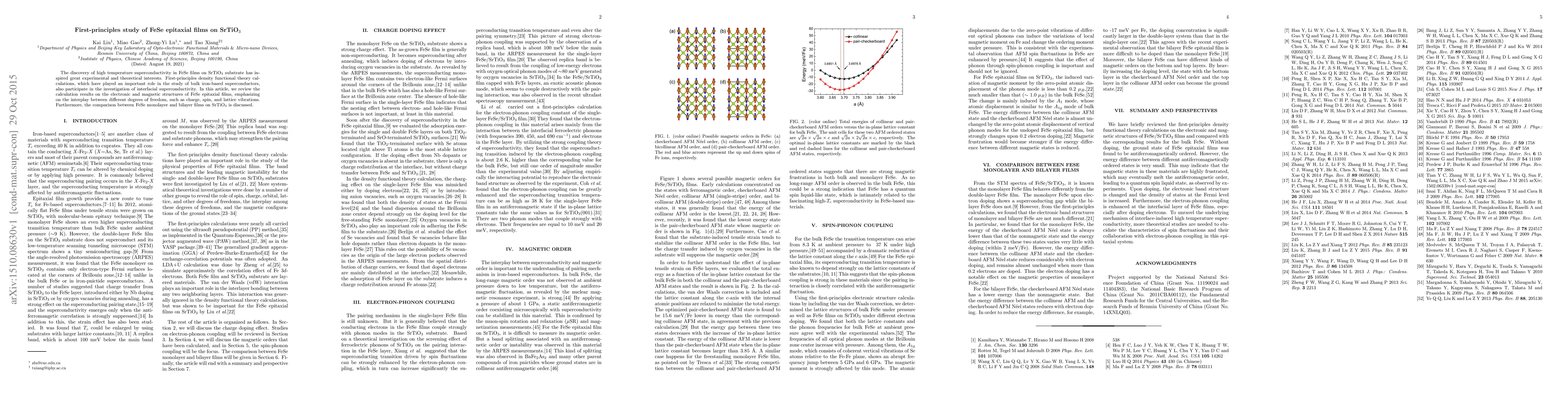 This paper uses first-principles density functional theory to explore the electronic and magnetic structures of FeSe epitaxial films on SrTiO3, highlighting the complex interactions between charge, spin, and lattice vibrations. It compares the properties of FeSe monolayer and bilayer films, contributing to the understanding of interfacial superconductivity.