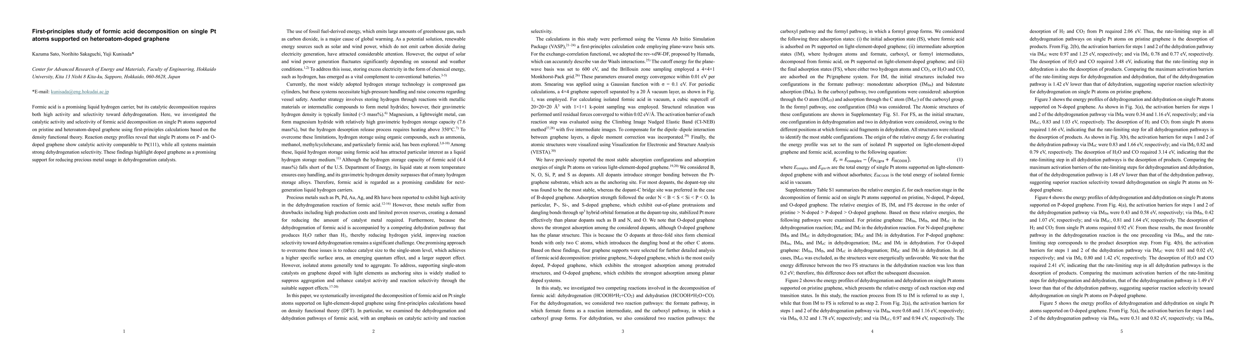 Formic acid is a promising liquid hydrogen carrier, but its catalytic decomposition requires both high activity and selectivity toward dehydrogenation. Here, we investigated the catalytic activity and selectivity of formic acid decomposition on single Pt atoms supported on pristine and heteroatom-doped graphene using first-principles calculations based on the density functional theory. Reaction energy profiles reveal that single Pt atoms on P- and O-doped graphene show catalytic activity comparable to Pt(111), while all systems maintain strong dehydrogenation selectivity. These findings highlight doped graphene as a promising support for reducing precious metal usage in dehydrogenation catalysts.