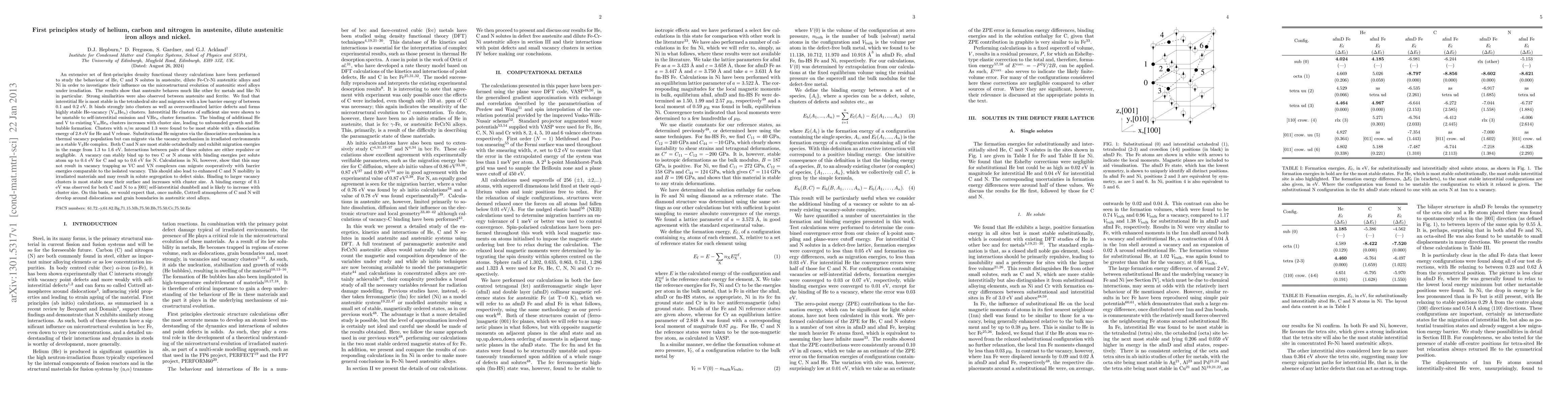 Summary: First-principles density functional theory calculations were conducted to explore the effects of He, C, and N in austenitic steel and nickel, focusing on their influence on microstructural changes under irradiation conditions. The results provide insights into the microstructural evolution in austenitic steel alloys.
