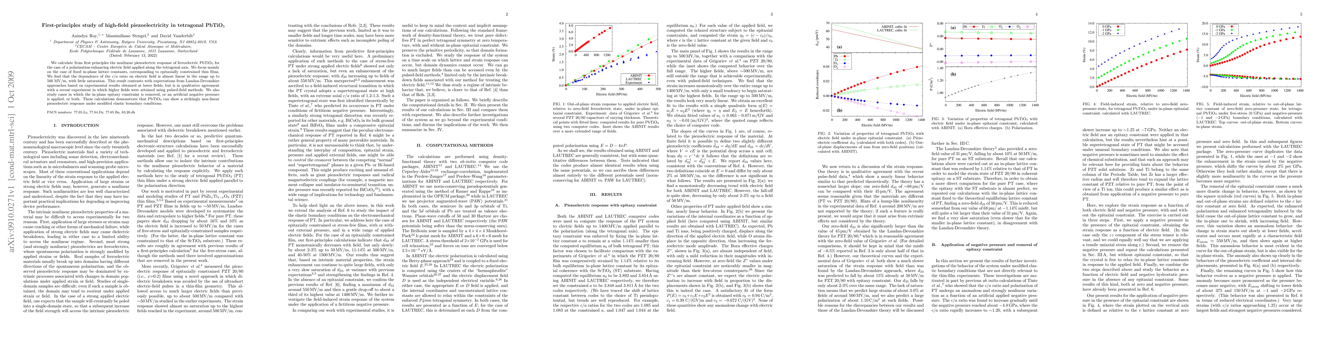 This study uses first-principles calculations to investigate the high-field piezoelectric response of tetragonal PbTiO3, revealing a nearly linear dependence of the c/a ratio on electric field up to 500 MV/m, contrasting with lower-field experimental expectations but aligning with recent high-field experiments. The research also explores the effects of different elastic boundary conditions on PbTiO3's piezoelectric behavior.