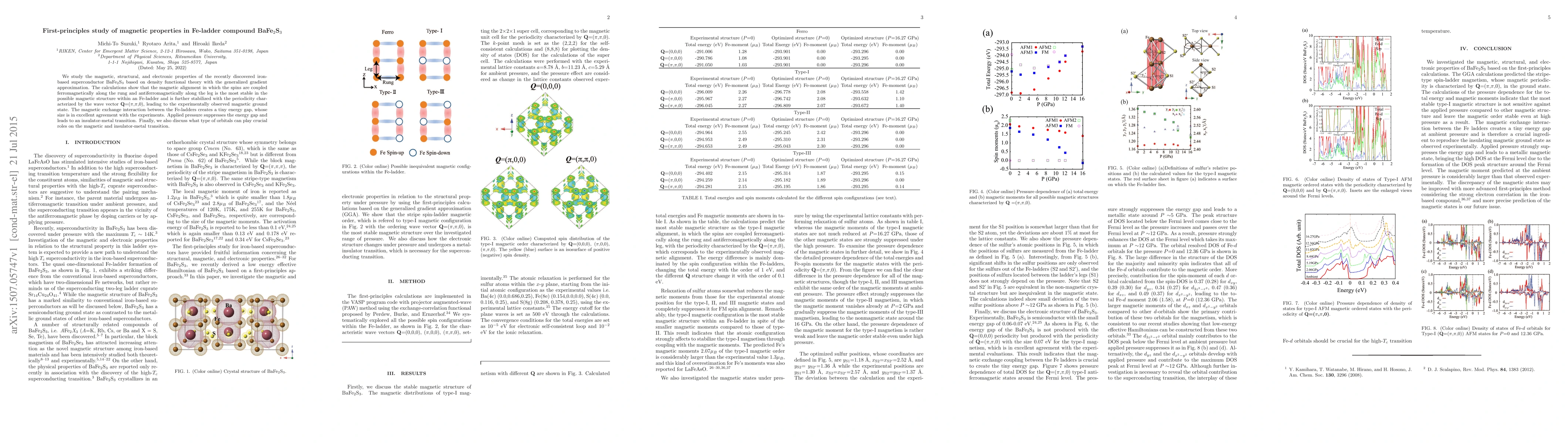 This study uses density functional theory to investigate the magnetic properties of the iron-based superconductor BaFe2S3, finding that a specific ferromagnetic-antiferromagnetic coupling in the Fe-ladder structure is the most stable, with a tiny energy gap consistent with experiments. Applied pressure induces an insulator-metal transition.