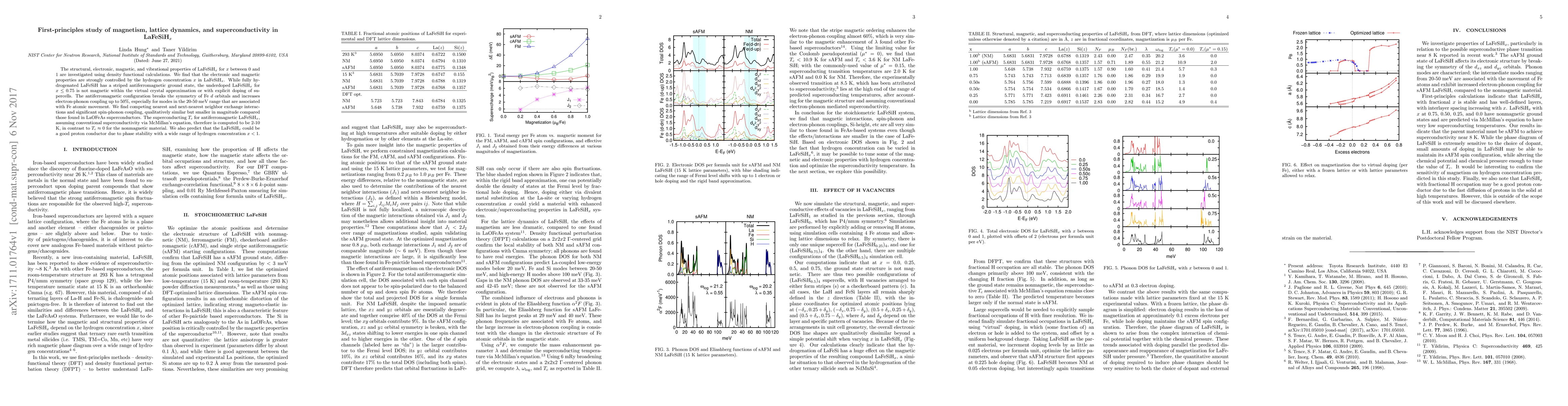 The structural, electronic, magnetic, and vibrational properties of LaFeSiH$_x$ for $x$ between 0 and 1 are investigated using density functional calculations. We find that the electronic and magnetic properties are strongly controlled by the hydrogen concentration $x$ in LaFeSiH$_x$. While fully hydrogenated LaFeSiH has a striped antiferromagnetic ground state, the underdoped LaFeSiH$_x$ for $x\leq0.75$ is not magnetic within the virtual crystal approximation or with explicit doping of supercells. The antiferromagnetic configuration breaks the symmetry of Fe $d$ orbitals and increases electron-phonon coupling up to $50\%$, especially for modes in the 20-50 meV range that are associated with Fe atomic movement. We find competing nearest and next-nearest neighbor exchange interactions and significant spin-phonon coupling, qualitatively similar but smaller in magnitude compared those found in LaOFeAs superconductors. The superconducting $T_c$ for antiferromagnetic LaFeSiH$_x$, assuming conventional superconductivity via McMillan's equation, therefore is computed to be 2-10 K, in contrast to $T_c\approx0$ for the nonmagnetic material. We also predict that the LaFeSiH$_x$ could be a good proton conductor due to phase stability with a wide range of hydrogen concentration $x < 1$.