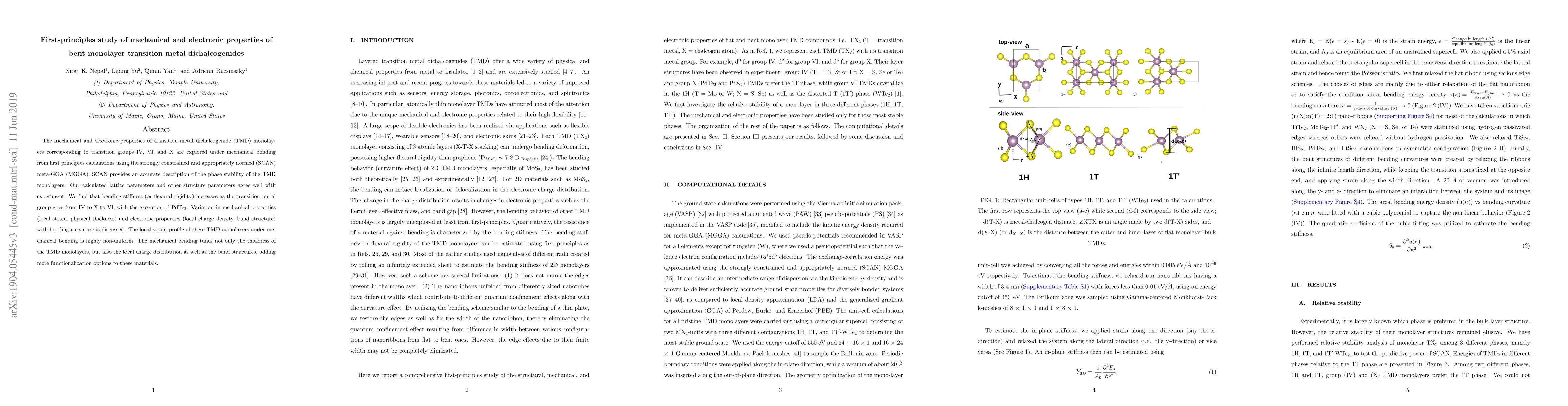 This study explores the mechanical and electronic properties of bent monolayer transition metal dichalcogenides (TMDs) using first-principles calculations with the SCAN meta-GGA method. It reveals that bending stiffness increases from group IV to VI TMDs, except for PdTe$_2$, and mechanical bending significantly alters the local strain, charge distribution, and band structure, offering new functionalization possibilities.