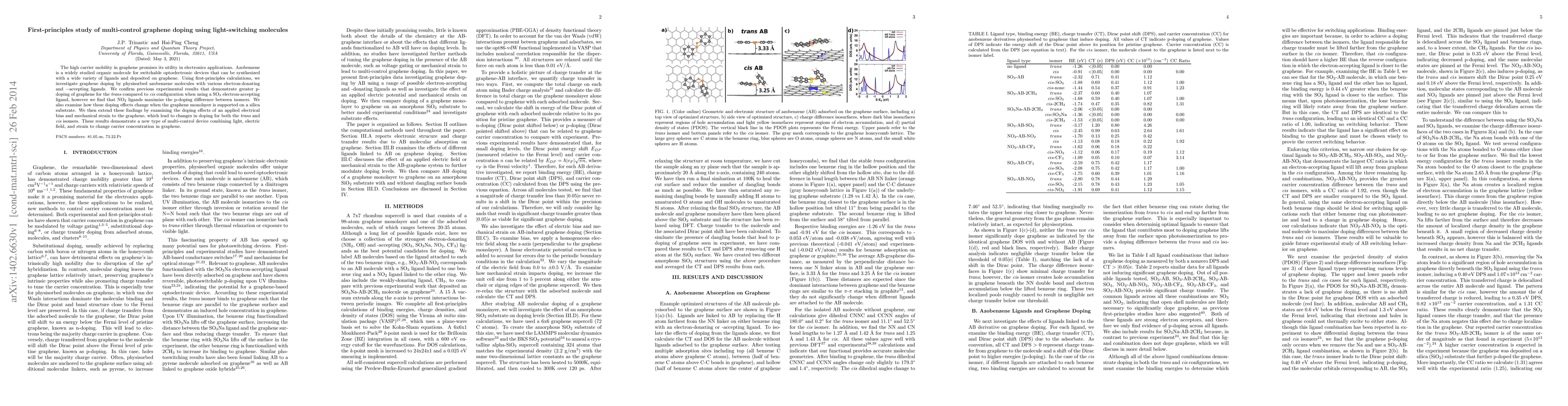 This study uses first-principles calculations to explore graphene doping via physisorbed azobenzene molecules with different ligands, revealing that NO$_2$ ligands maximize p-doping differences between trans and cis isomers. The research also investigates the effects of substrate, electrical bias, and mechanical strain on doping, demonstrating a multi-control approach to modulate carrier concentration in graphene.