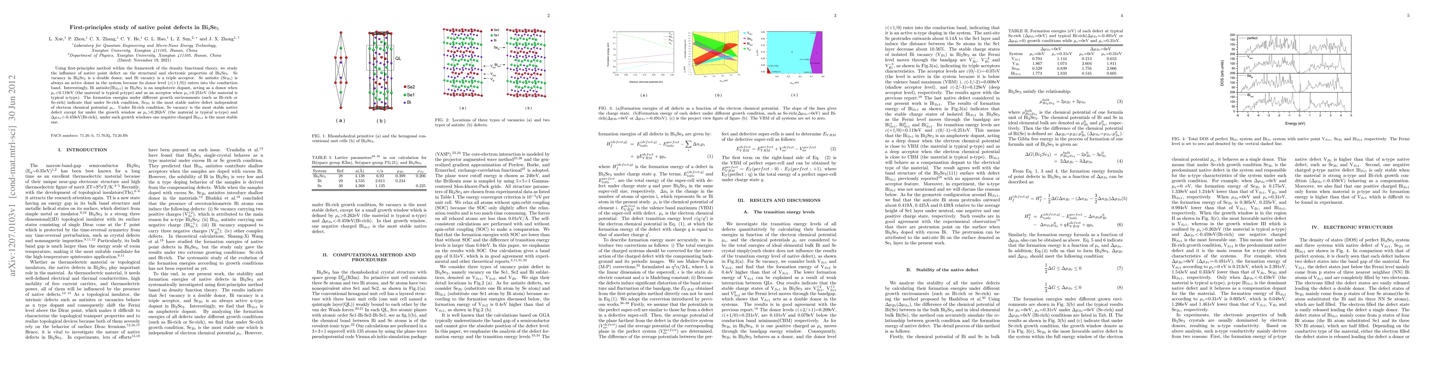 This paper investigates native point defects in Bi$_2$Se$_3$ using density functional theory, finding that Se vacancies are double donors, Bi vacancies are triple acceptors, and Se antisite is a strong donor. Bi antisite is amphoteric, acting as a donor or acceptor depending on the electron chemical potential. Se antisite is most stable under Se-rich conditions, while Se vacancies are stable under Bi-rich conditions except in specific growth windows.