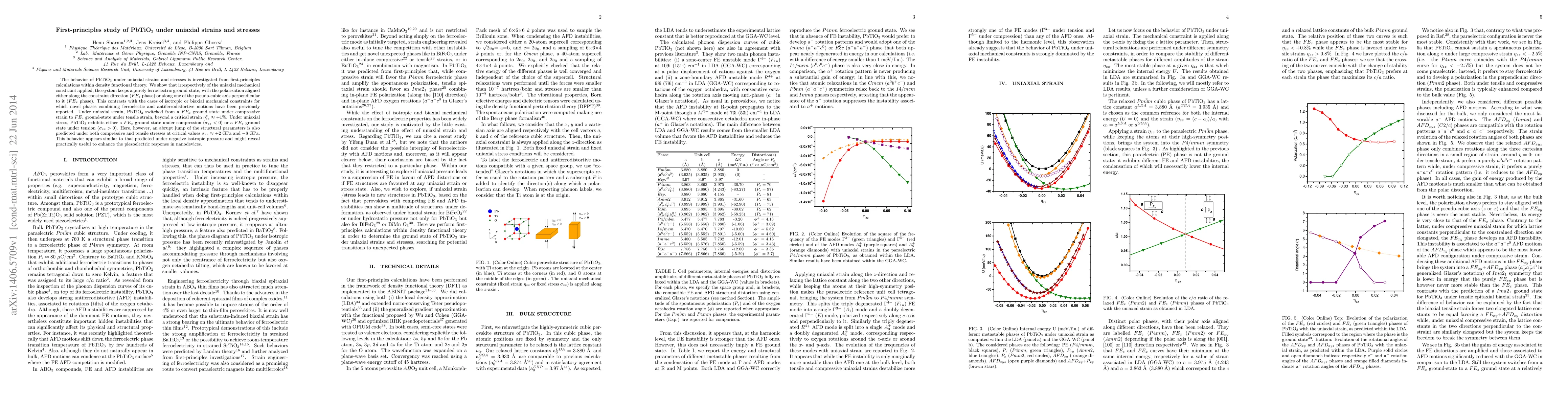 The behavior of PbTiO$_3$ under uniaxial strains and stresses is investigated from first-principles calculations within density functional theory. We show that irrespectively of the uniaxial mechanical constraint applied, the system keeps a purely ferroelectric ground-state, with the polarization aligned either along the constraint direction ($FE_z$ phase) or along one of the pseudo-cubic axis perpendicular to it ($FE_x$ phase). This contrasts with the cases of isotropic or biaxial mechanical constraints for which novel phases combining ferroelectic and antiferrodistortive motions have been previously reported. Under uniaxial strain, PbTiO$_3$ switched from a $FE_x$ ground state under compressive strain to $FE_z$ ground-state under tensile strain, beyond a critical strain $\eta_{zz}^c \approx +1$\%. Under uniaxial stress, PbTiO$_3$ exhibits either a $FE_x$ ground state under compression ($\sigma_{zz} < 0$) or a $FE_z$ ground state under tension ($\sigma_{zz} > 0$). Here, however, an abrupt jump of the structural parameters is also predicted under both compressive and tensile stresses at critical values $\sigma_{zz} \approx$ $+2$ GPa and $- 8$ GPa. This behavior appears similar to that predicted under negative isotropic pressure and might reveal practically useful to enhance the piezoelectric response in nanodevices.
