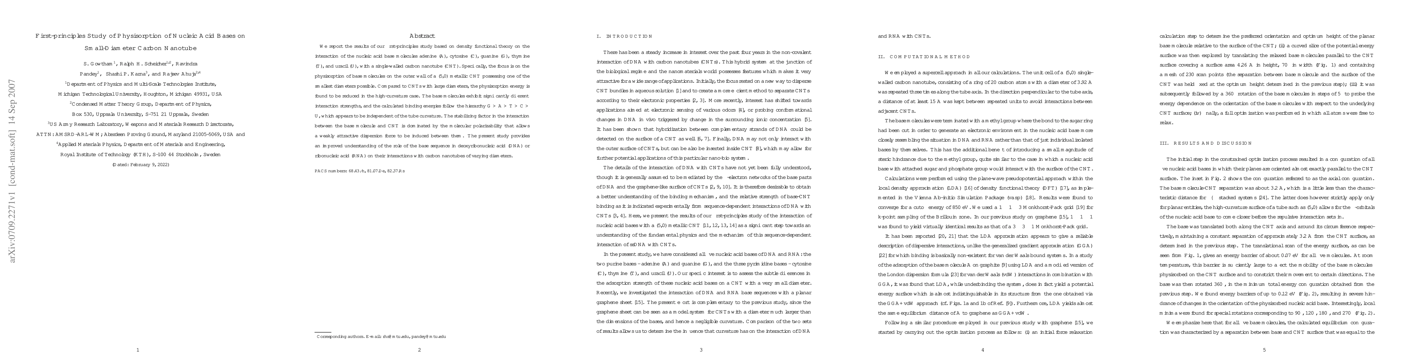 This study uses first-principles density functional theory to investigate the physisorption of nucleic acid bases on a small-diameter metallic carbon nanotube, finding reduced physisorption energy due to high curvature. The interaction hierarchy is G > A > T > C > U, driven by molecular polarizability.