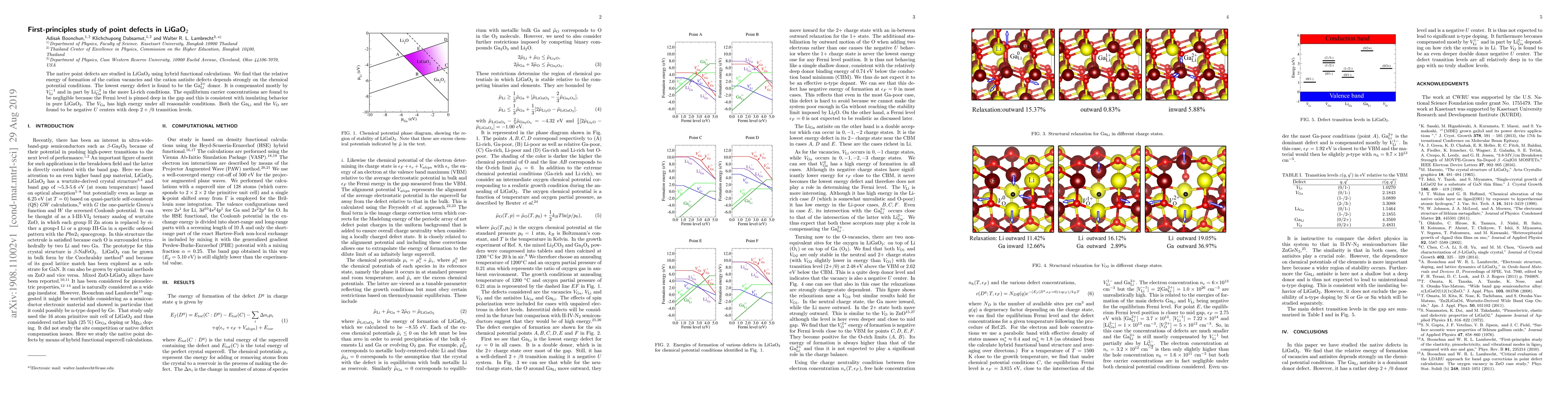 The native point defects are studied in LiGaO2 using hybrid functional calculations. We find that the relative energy of formation of the cation vacancies and the cation antisite defects depends strongly on the chemical potential conditions. The lowest energy defect is found to be the Ga_Li^2+ donor. It is compensated mostly by V_Li^-1and in part by Li_Ga^-2 in the more Li-rich conditions. The equilibrium carrier concentrations are found to be negligible because the Fermi level is pinned deep in the gap and this is consistent with insulating behavior in pure LiGaO2. The V_Ga has high energy under all reasonable conditions. Both the Ga_Li and the V_O are found to be negative U centers with deep 2+/0 transition levels.