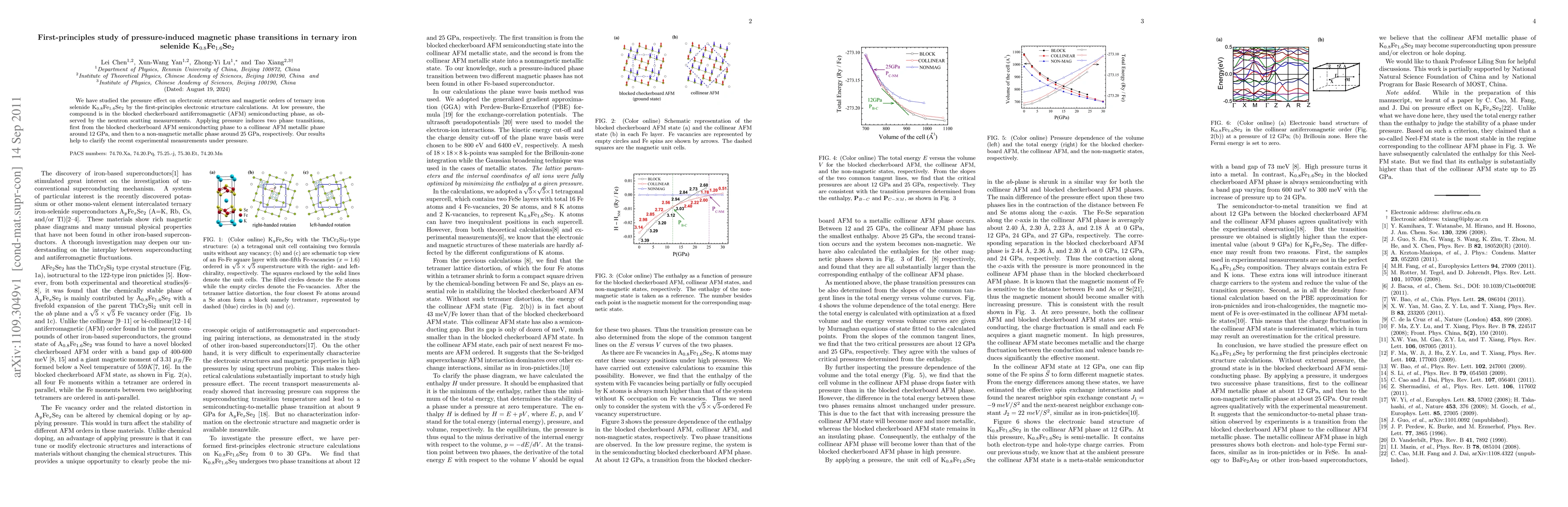 We have studied the pressure effect on electronic structures and magnetic orders of ternary iron selenide K$_{0.8}$Fe$_{1.6}$Se$_2$ by the first-principles electronic structure calculations. At low pressure, the compound is in the blocked checkerboard antiferromagnetic (AFM) semiconducting phase, as observed by the neutron scatting measurements. Applying pressure induces two phase transitions, first from the blocked checkerboard AFM semiconducting phase to a collinear AFM metallic phase around 12 GPa, and then to a non-magnetic metallic phase around 25 GPa, respectively. Our results help to clarify the recent experimental measurements under pressure.