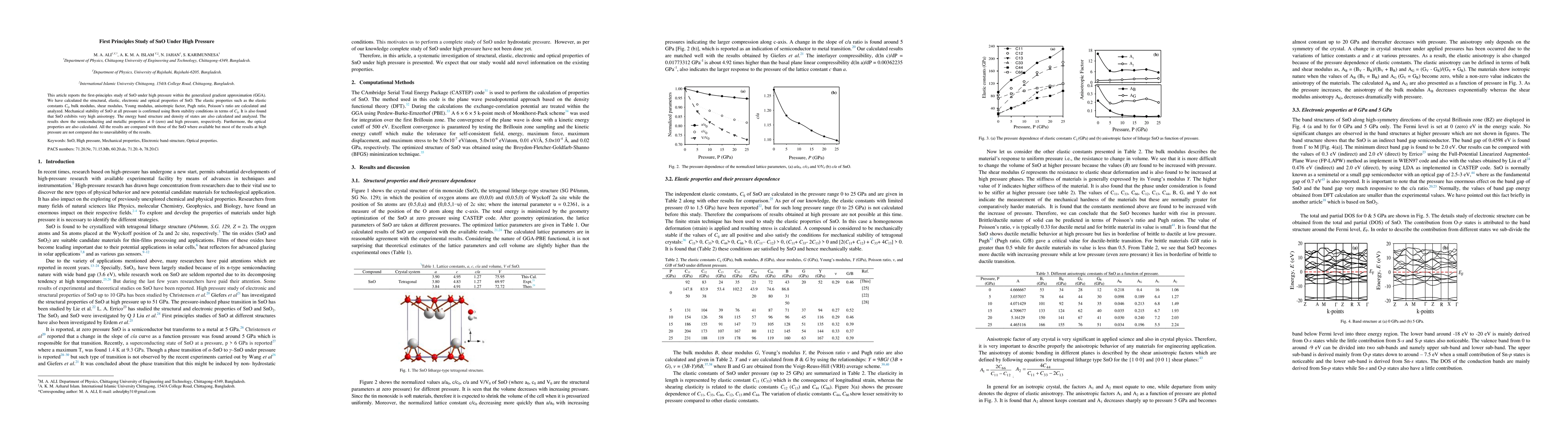 This study uses first-principles calculations to analyze SnO under high pressure, confirming its mechanical stability and ductile behavior. SnO exhibits semiconducting properties at zero pressure and metallic properties at high pressure, with significant anisotropy and detailed optical properties also investigated.