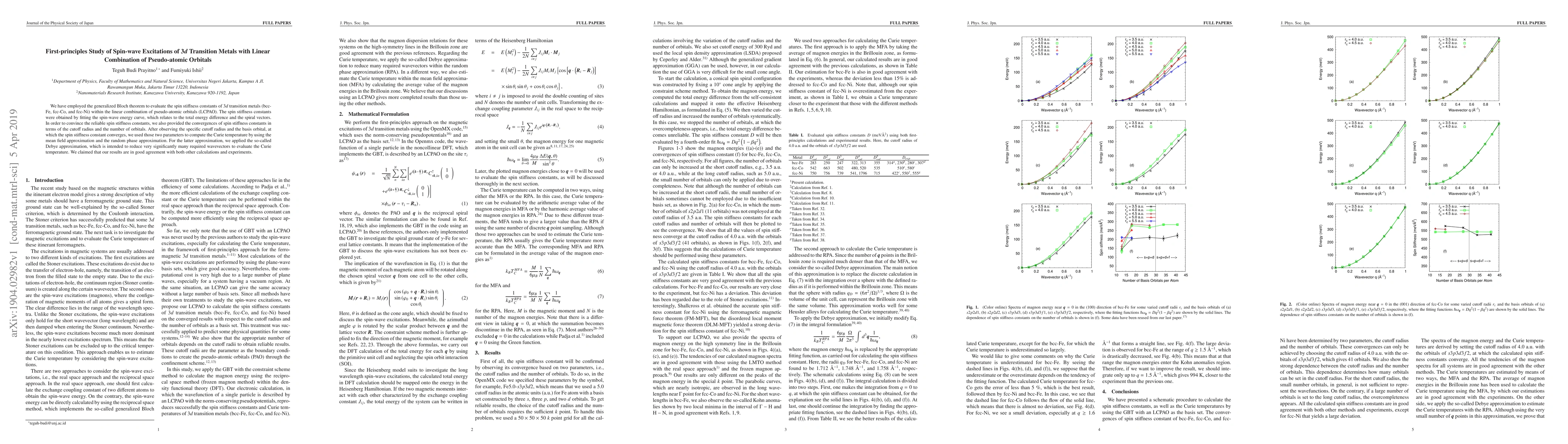 We have employed the generalized Bloch theorem to evaluate the spin stiffness constants of 3$d$ transition metals (bcc-Fe, fcc-Co, and fcc-Ni) within the linear combination of pseudo-atomic orbitals (LCPAO). The spin stiffness constants were obtained by fitting the spin-wave energy curve, which relates to the total energy difference and the spiral vectors. In order to convince the reliable spin stiffness constants, we also provided the convergences of spin stiffness constants in terms of the cutoff radius and the number of orbitals. After observing the specific cutoff radius and the basis orbital, at which the spin stiffness constant converges, we used those two parameters to compute the Curie temperature by using the mean field approximation and the random phase approximation. For the latter approximation, we applied the so-called Debye approximation, which is intended to reduce very significantly many required wavevectors to evaluate the Curie temperature. We claimed that our results are in good agreement with both other calculations and experiments.