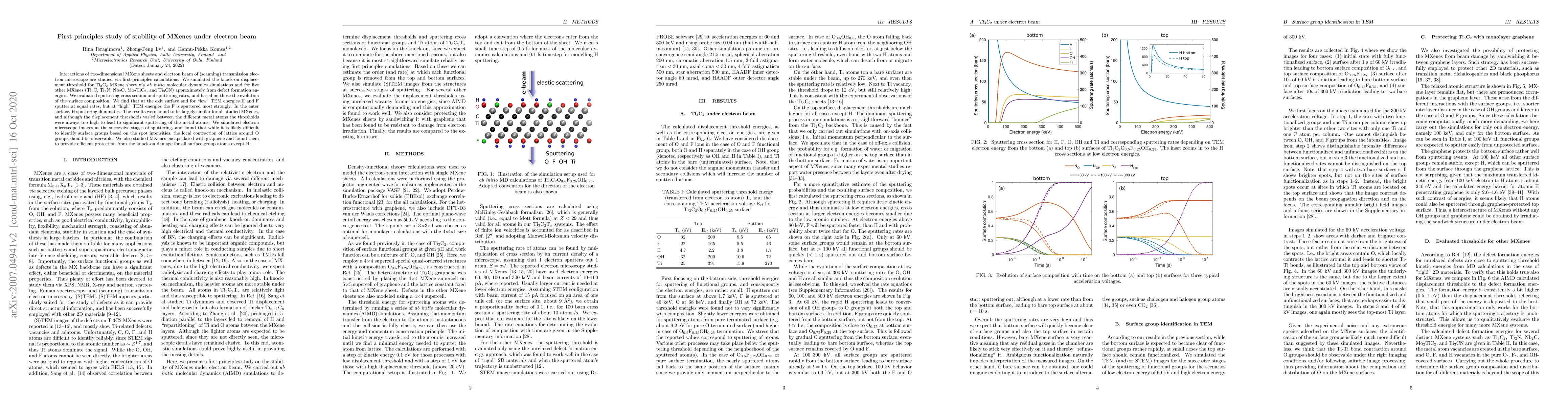 This study investigates the stability of MXenes under electron beam exposure using first-principles calculations, finding that while surface groups like H and F can sputter at varying rates, metal atoms are largely unaffected. Encapsulation with graphene provides effective protection against knock-on damage for all surface groups except H.