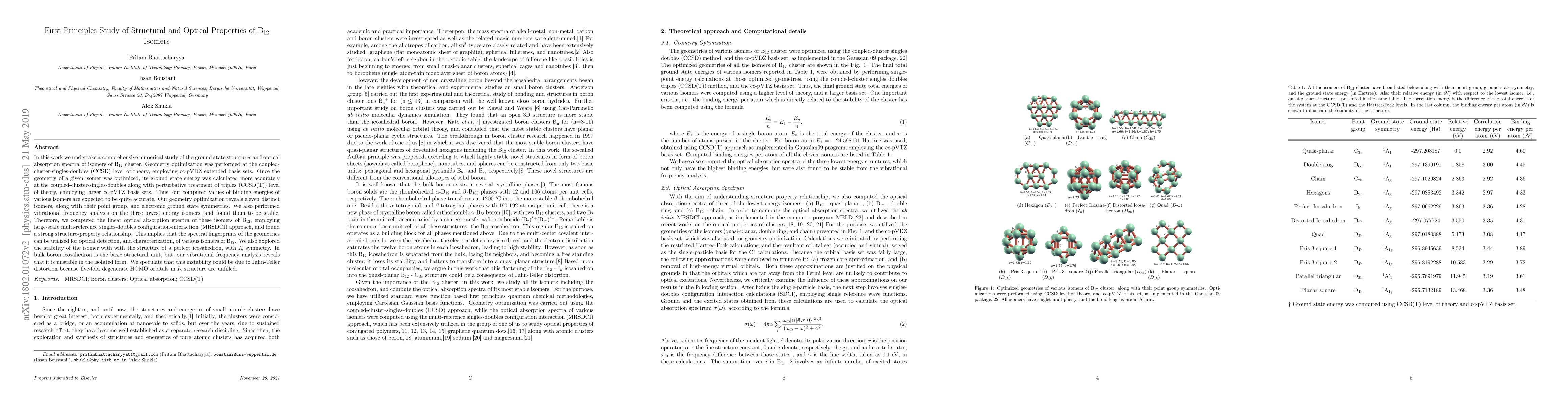 In this work we undertake a comprehensive numerical study of the ground state structures and optical absorption spectra of isomers of B$_{12}$ cluster. Geometry optimization was performed at the coupled-cluster-singles-doubles (CCSD) level of theory, employing cc-pVDZ extended basis sets. Once the geometry of a given isomer was optimized, its ground state energy was calculated more accurately at the coupled-cluster-singles-doubles along with perturbative treatment of triples (CCSD(T)) level of theory, employing larger cc-pVTZ basis sets. Thus, our computed values of binding energies of various isomers are expected to be quite accurate. Our geometry optimization reveals eleven distinct isomers, along with their point group, and electronic ground state symmetries. We also performed vibrational frequency analysis on the three lowest energy isomers, and found them to be stable. Therefore, we computed the linear optical absorption spectra of these isomers of B$_{12}$, employing large-scale multi-reference singles-doubles configuration-interaction (MRSDCI) approach, and found a strong structure-property relationship. This implies that the spectral fingerprints of the geometries can be utilized for optical detection, and characterization, of various isomers of B$_{12}$. We also explored the stability of the isomer with with the structure of a perfect icosahedron, with $I_{h}$ symmetry. In bulk boron icosahedron is the basic structural unit, but, our vibrational frequency analysis reveals that it is unstable in the isolated form. We speculate that this instability could be due to Jahn-Teller distortion because five-fold degenerate HOMO orbitals in $I_{h}$ structure are unfilled.