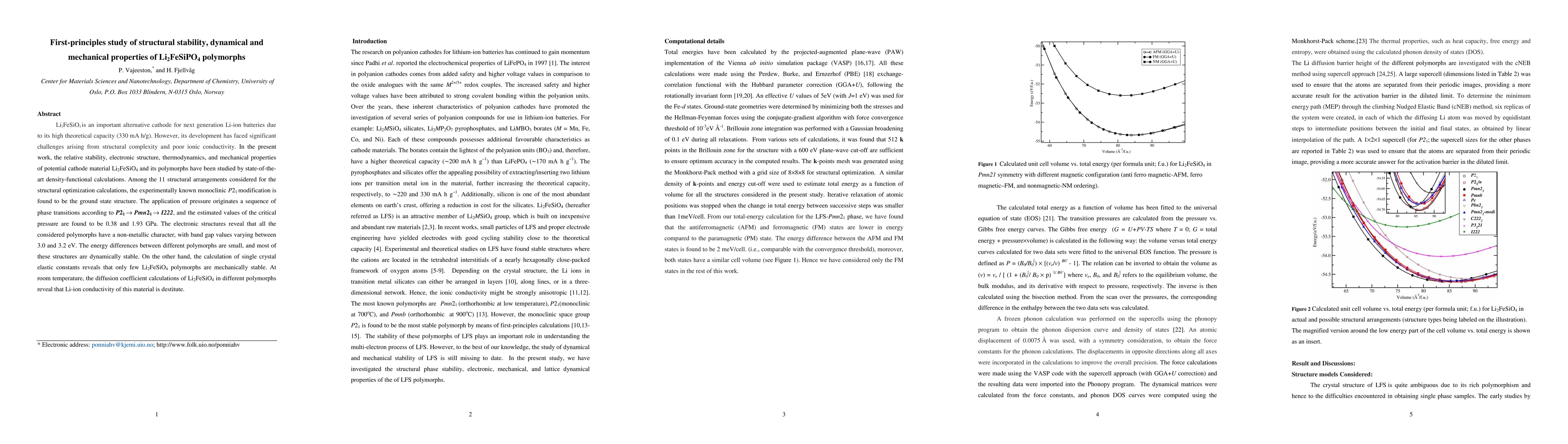 This study investigates the structural stability, electronic properties, and mechanical stability of Li2FeSiO4 polymorphs using density-functional calculations. The monoclinic P21 phase is identified as the ground state, while pressure-induced phase transitions occur at 0.38 and 1.93 GPa. Despite small energy differences and non-metallic electronic structures, Li-ion conductivity remains poor, and only a few polymorphs exhibit mechanical stability.