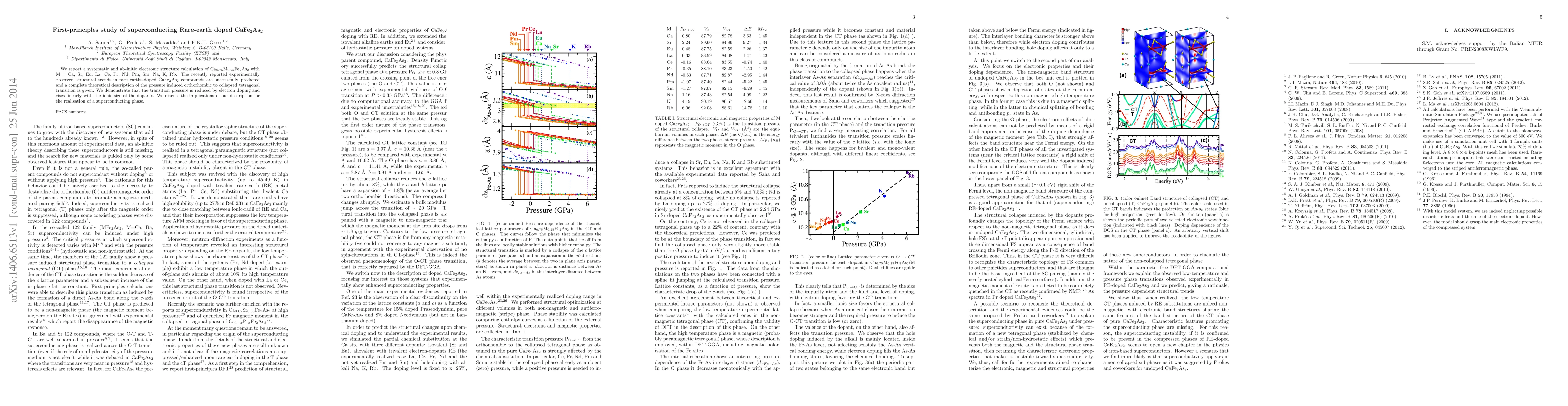 Researchers used ab-initio calculations to study rare-earth doped CaFe2As2 compounds, predicting a pressure-induced transition that affects superconducting properties. The findings suggest that electron doping reduces the transition pressure and linearly increases with ionic size of the dopants.