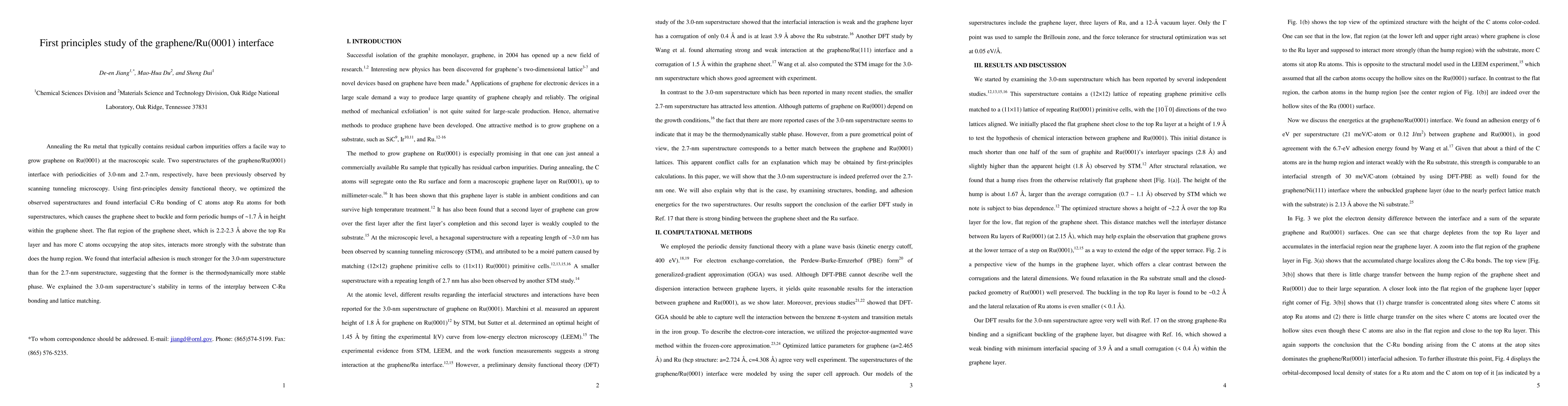 This study uses first-principles density functional theory to optimize graphene/Ru(0001) interface superstructures, revealing stronger adhesion and stability for the 3.0-nm periodicity due to stronger C-Ru bonding atop sites and better lattice matching.