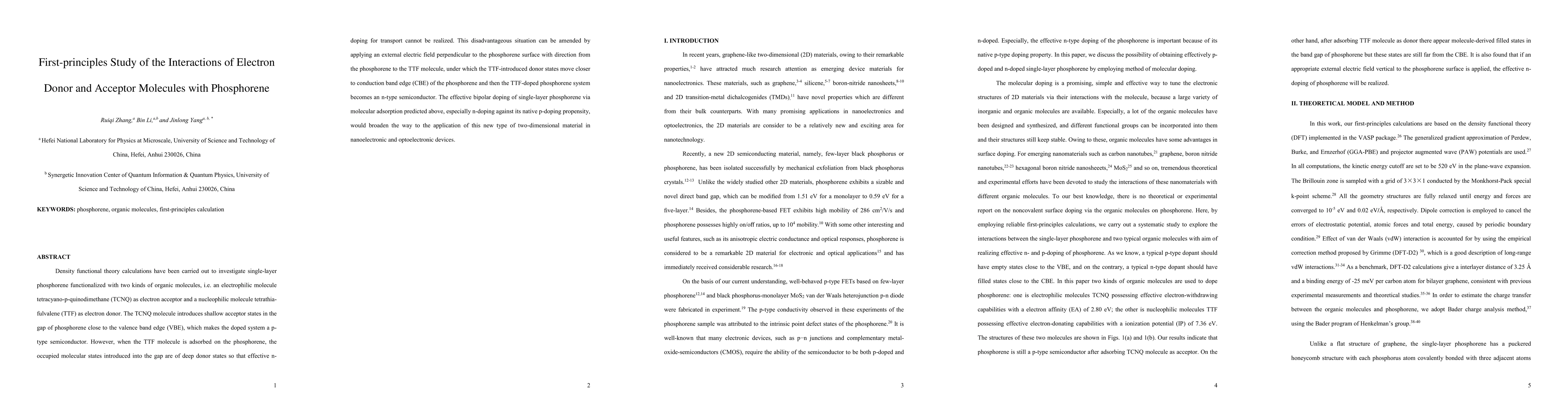 Researchers used density functional theory to study how phosphorene, a new 2D material, interacts with organic molecules as electron donors or acceptors. They found that applying an external electric field can turn phosphorene into an n-type semiconductor when using certain donor molecules.