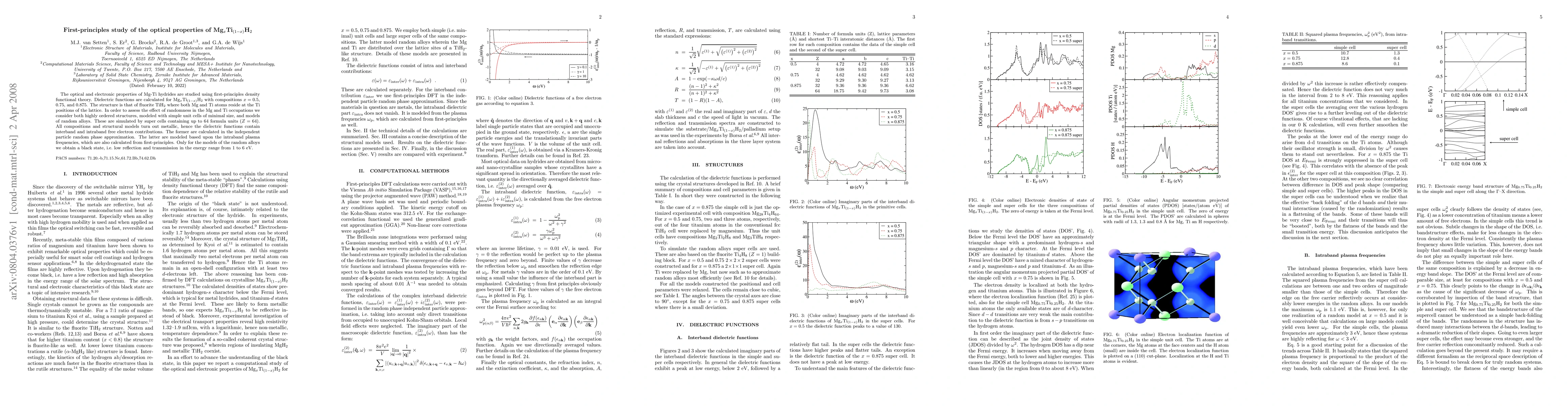 The optical and electronic properties of Mg-Ti hydrides are studied using first-principles density functional theory. Dielectric functions are calculated for MgxTi(1-x)H2 with compositions x = 0.5, 0.75, and 0.875. The structure is that of fluorite TiH2 where both Mg and Ti atoms reside at the Ti positions of the lattice. In order to assess the effect of randomness in the Mg and Ti occupations we consider both highly ordered structures, modeled with simple unit cells of minimal size, and models of random alloys. These are simulated by super cells containing up to 64 formula units (Z = 64). All compositions and structural models turn out metallic, hence the dielectric functions contain interband and intraband free electron contributions. The former are calculated in the independent particle random phase approximation. The latter are modeled based upon the intraband plasma frequencies, which are also calculated from first-principles. Only for the models of the random alloys we obtain a black state, i.e. low reflection and transmission in the energy range from 1 to 6 eV.