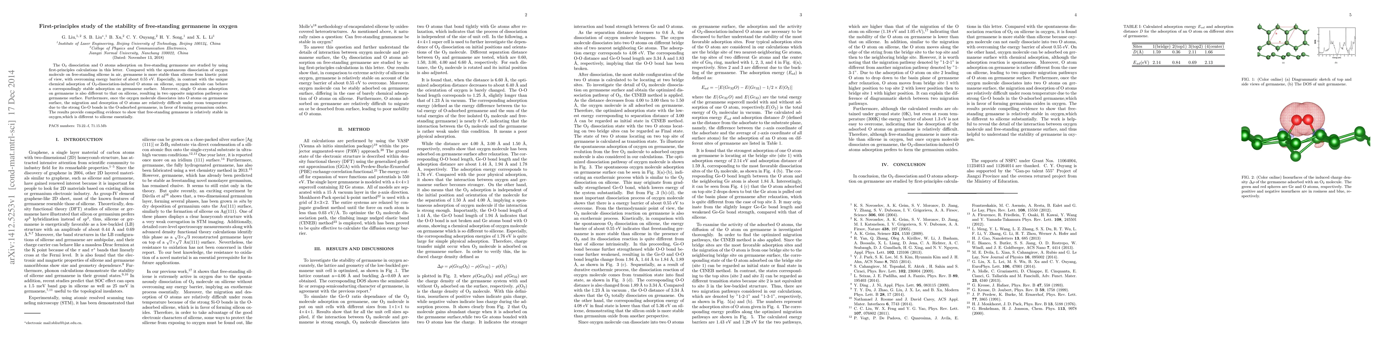 This study reveals that free-standing germanene is more kinetically stable than silicene in oxygen, with a lower energy barrier for O2 dissociation and stable adsorption of O atoms, leading to the formation of germanium oxides. Unlike silicene, germanene exhibits distinct adsorption behaviors and strong Ge-O bonds, making it relatively stable in oxygen.