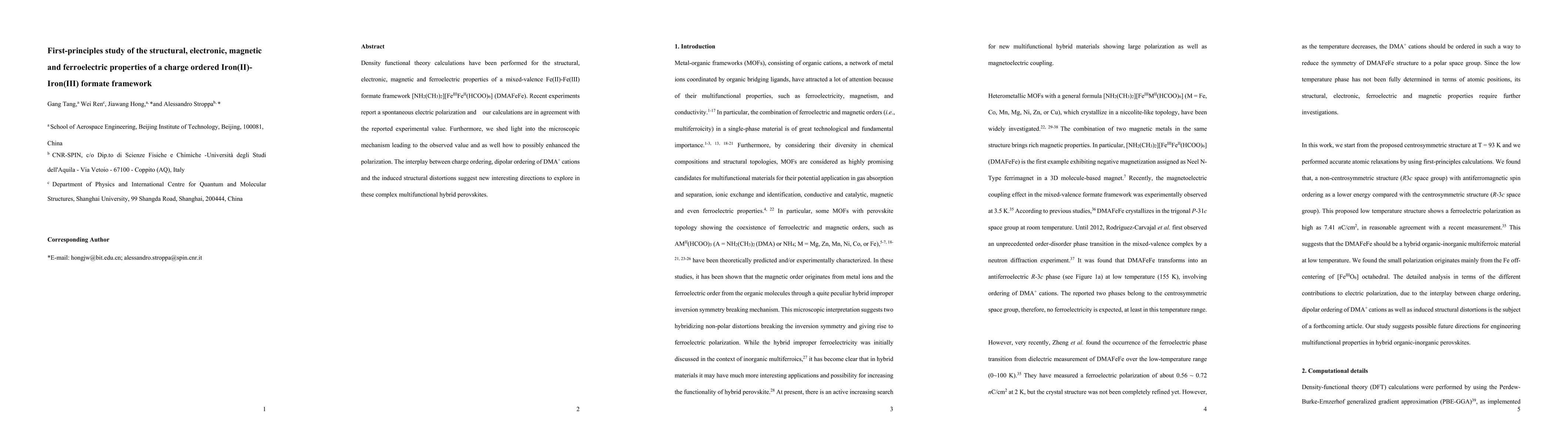 This study uses density functional theory to investigate the structural, electronic, magnetic, and ferroelectric properties of a mixed-valence iron formate framework. The calculations confirm the spontaneous electric polarization observed experimentally and elucidate the underlying microscopic mechanisms, suggesting potential enhancements and new research directions for multifunctional hybrid perovskites.