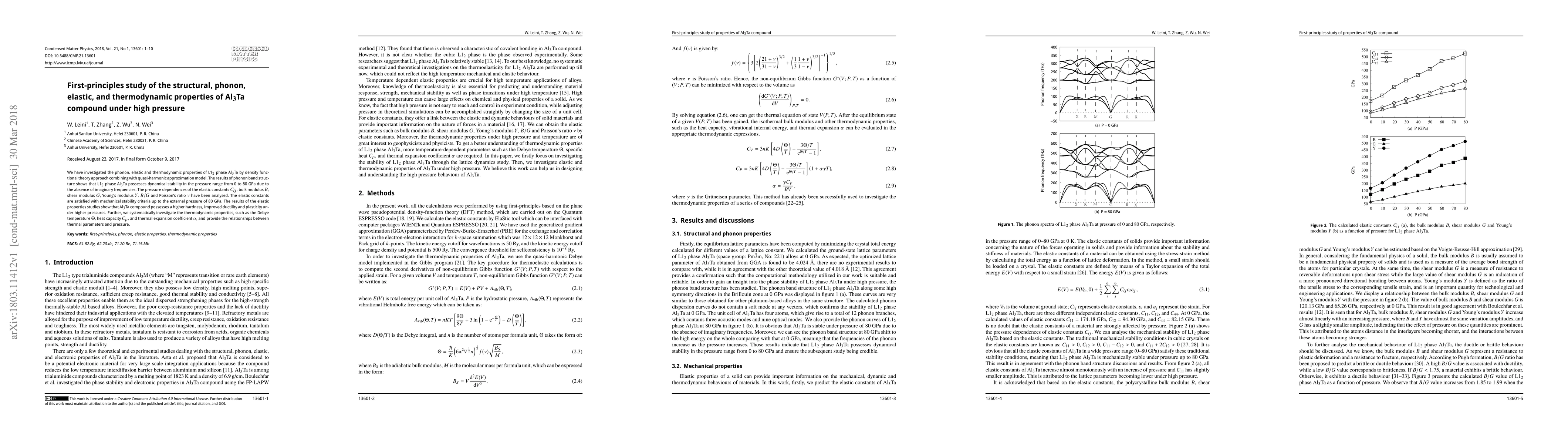 We have investigated the phonon, elastic and thermodynamic properties of L1$_{2}$ phase Al$_{3}$Ta by density functional theory approach combining with quasi-harmonic approximation model. The results of phonon band structure shows that L1$_{2}$ phase Al$_{3}$Ta possesses dynamical stability in the pressure range from 0 to 80 GPa due to the absence of imaginary frequencies. The pressure dependences of the elastic constants $C_{ij}$, bulk modulus $B$, shear modulus $G$, Young's modulus $Y$, $B/G$ and Poisson's ratio $\nu$ have been analysed. The elastic constants are satisfied with mechanical stability criteria up to the external pressure of 80 GPa. The results of the elastic properties studies show that Al$_{3}$Ta compound possesses a higher hardness, improved ductility and plasticity under higher pressures. Further, we systematically investigate the thermodynamic properties, such as the Debye temperature $\Theta$, heat capacity $C_{p}$, and thermal expansion coefficient $\alpha$, and provide the relationships between thermal parameters and pressure.