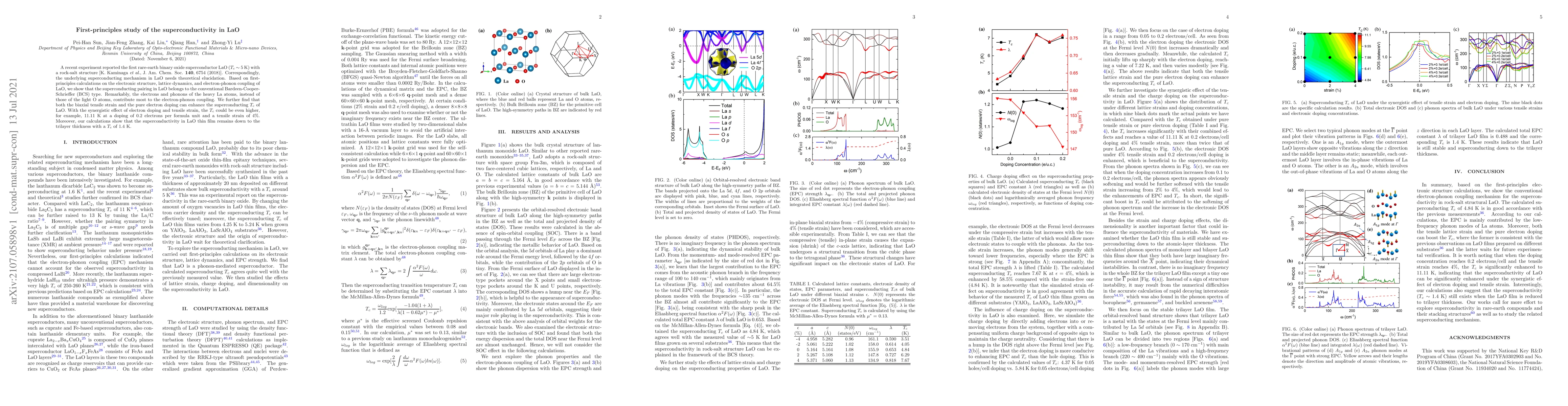 A recent experiment reported the first rare-earth binary oxide superconductor LaO ($T_c $ $\sim$ 5 K) with a rock-salt structure [K. Kaminaga et al., J. Am. Chem. Soc. 140, 6754 (2018)]. Correspondingly, the underlying superconducting mechanism in LaO needs theoretical elucidation. Based on first-principles calculations on the electronic structure, lattice dynamics, and electron-phonon coupling of LaO, we show that the superconducting pairing in LaO belongs to the conventional Bardeen-Cooper-Schrieffer (BCS) type. Remarkably, the electrons and phonons of the heavy La atoms, instead of those of the light O atoms, contribute most to the electron-phonon coupling. We further find that both the biaxial tensile strain and the pure electron doping can enhance the superconducting $T_c$ of LaO. With the synergistic effect of electron doping and tensile strain, the $T_c$ could be even higher, for example, 11.11 K at a doping of 0.2 electrons per formula unit and a tensile strain of $4\%$. Moreover, our calculations show that the superconductivity in LaO thin film remains down to the trilayer thickness with a $T_c$ of 1.4 K.