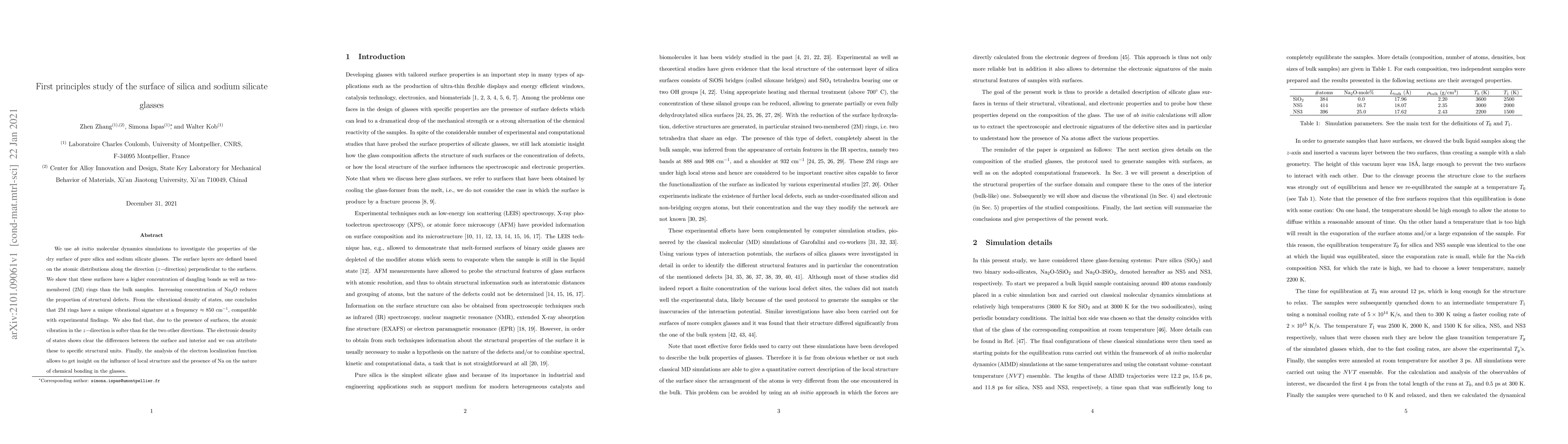We use \textit{ab initio} molecular dynamics simulations to investigate the properties of the dry surface of pure silica and sodium silicate glasses. The surface layers are defined based on the atomic distributions along the direction ($z-$direction) perpendicular to the surfaces. We show that these surfaces have a higher concentration of dangling bonds as well as two-membered (2M) rings than the bulk samples. Increasing concentration of Na$_2$O reduces the proportion of structural defects. From the vibrational density of states, one concludes that 2M rings have a unique vibrational signature at a frequency $\approx850$~cm$^{-1}$, compatible with experimental findings. We also find that, due to the presence of surfaces, the atomic vibration in the $z-$direction is softer than for the two other directions. The electronic density of states shows clear the differences between the surface and interior and we can attribute these to specific structural units. Finally, the analysis of the electron localization function allows to get insight on the influence of local structure and the presence of Na on the nature of chemical bonding in the glasses.